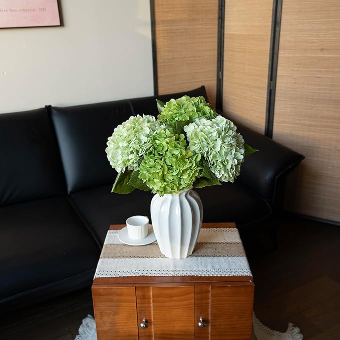 - [VERY REALISTIC APPEARANCE]: The Artificial Hydrangeas look like real,real touch materialr,full and soft petals,No smell,safe for people and pets.More real, bigger and softer than ordinary hydrangea.After spraying water, the petals can condense water drops, can be placed outdoors, and resistant to fading.Note: The vase is NOT included!