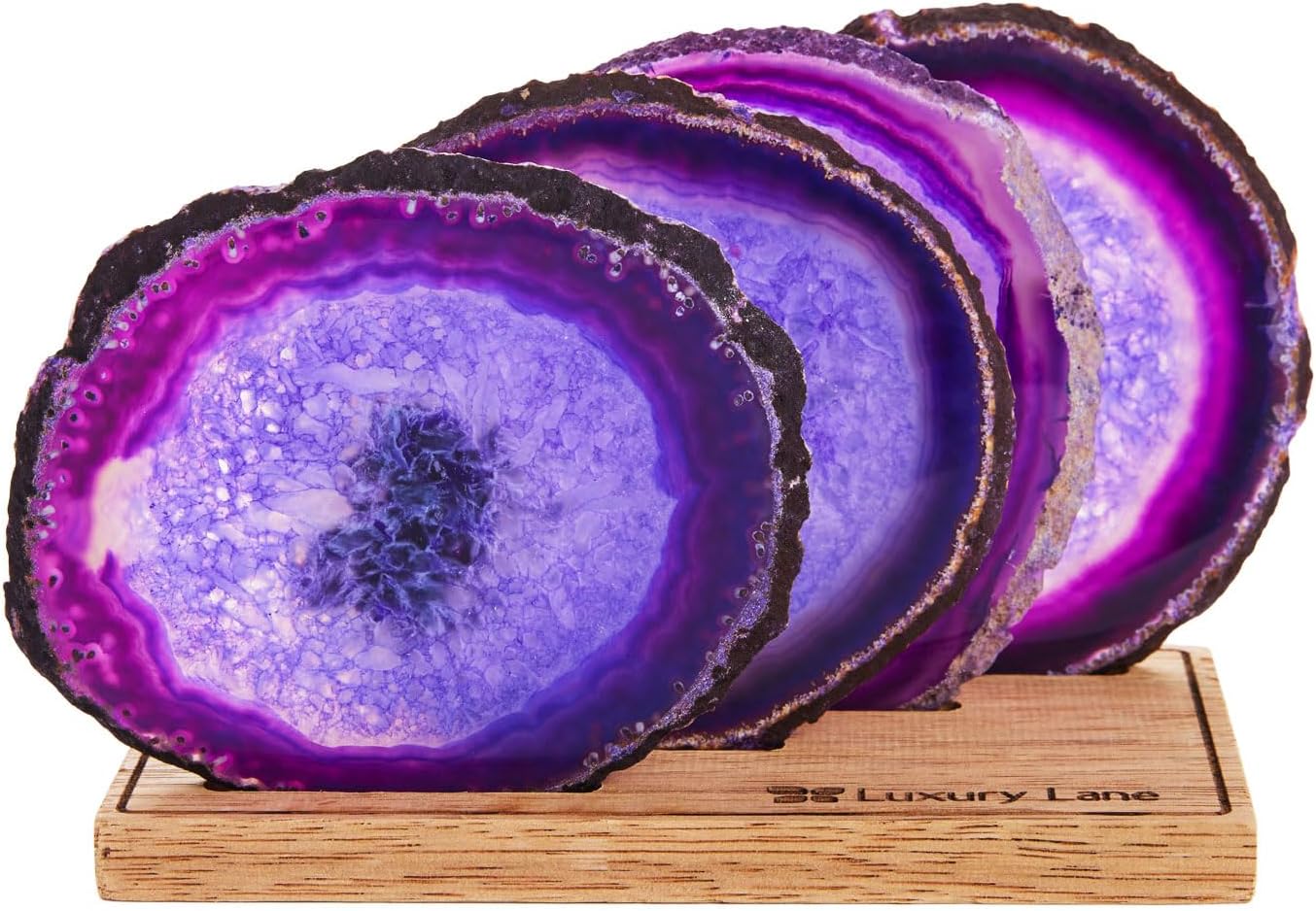 Luxury Lane Set of 4 Large Natural Brazilian Agate Slice Geode Rock Stone Drink Coasters with Wood Holder 4.3-4.7 inch Centerpiece Table Decoration, Amthyst Purple