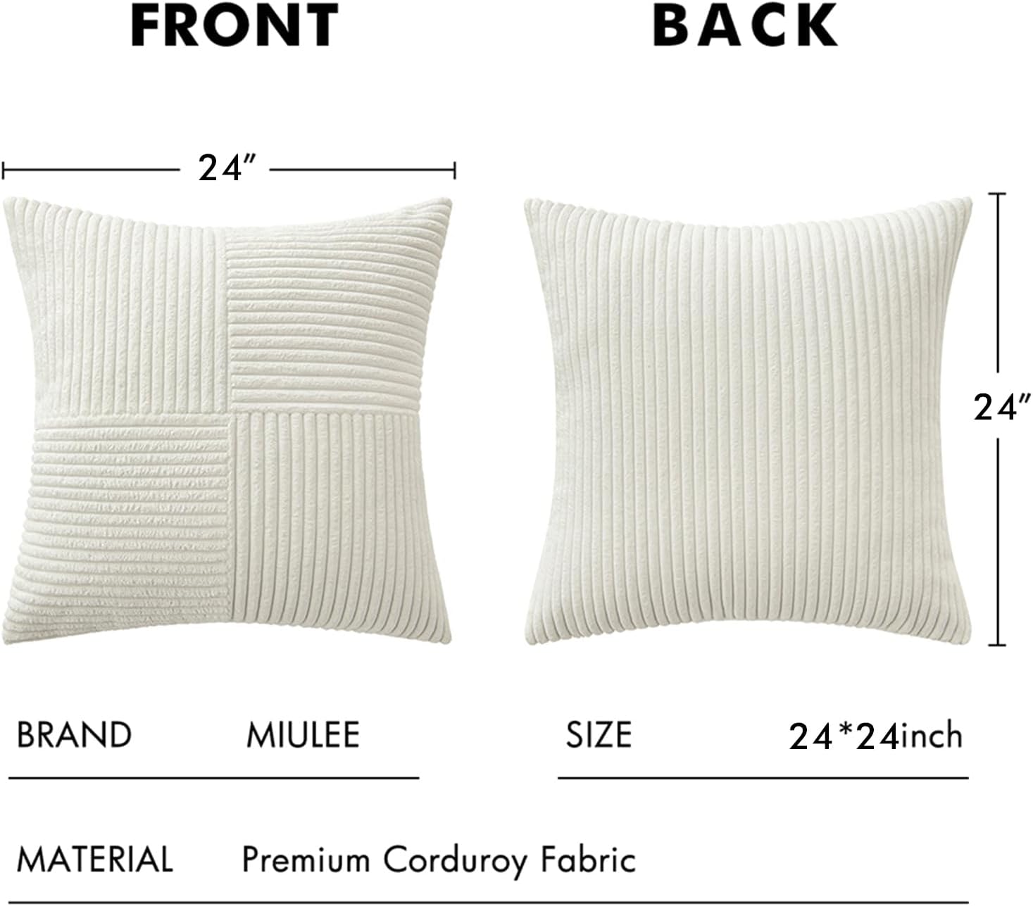 MIULEE 24x24 inch Euro White Corduroy Pillow Covers Pack of 2 Boho Decorative Spliced Throw Pillow Covers Soft Solid Couch Pillowcases Cross Patchwork Textured Cushion Covers for Living Room Bed Sofa