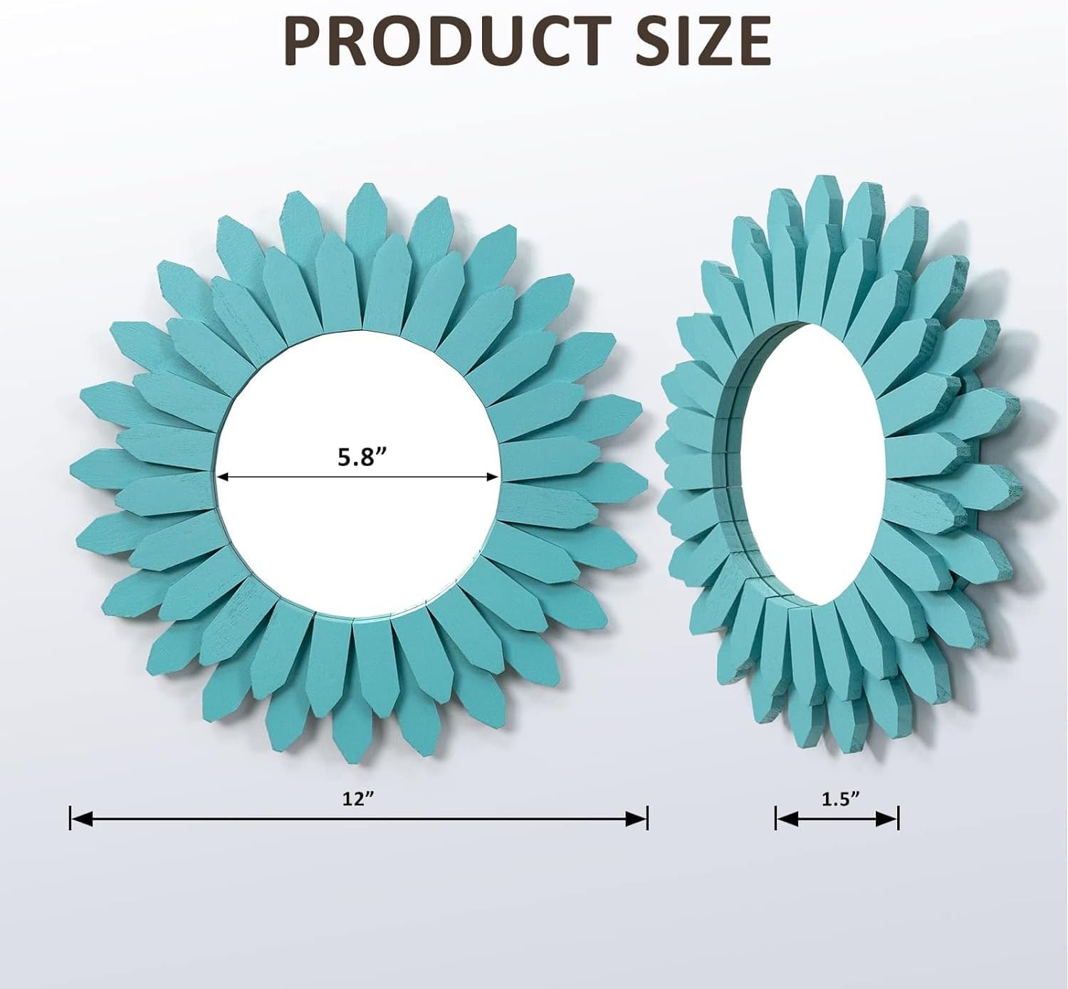 Honiway Beach Wall Decor Mirror 2 Pack 12 inch Wood Coastal Wall Decor Sunburst Boho Home Decor Room Decor for Bedroom Living Room Entryway Cyan