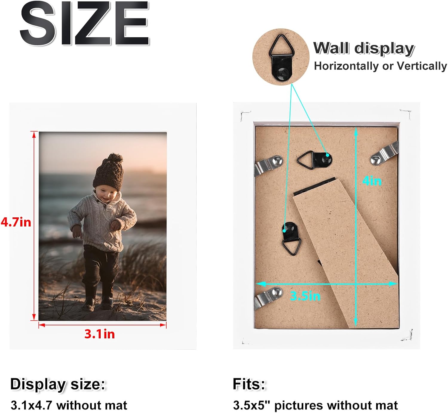 - SOLID WOOD: Kinlink white 3.5x5 photo frames are fitting for standard pictures 3.5x5 without mat. These 3.5x5 frames are made of light weight solid wood, with transparent, non-toxic acrylic glass front that gives a clear view of your pictures and preserves your precious memories as well. It is worth noticing that remove the protective film on the glass before use.