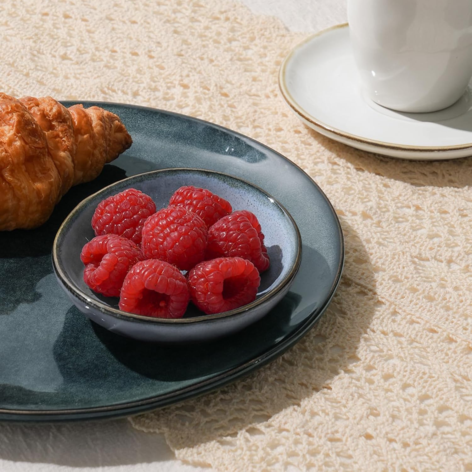 - Double Reactive Glaze: Double reactive glaze is combined through firing at high temperatures to create a unique and stunning glaze effect. The color of the same set of tableware may have some differences, so that each plate and bowl is unique. This glaze also tends to show different colors depending on the light. The color may be a little different from what you see on the screen.