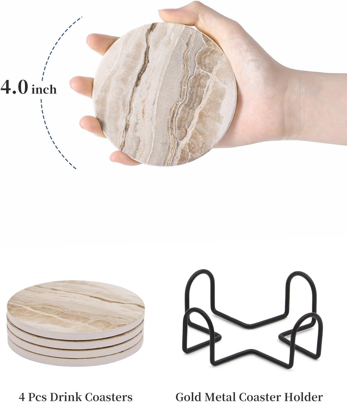 LIFVER Absorbent Coaster Sets of 4, Drink Coasters with Holder, Marble Style Ceramic Drink Coaster for Tabletop Protection, Suitable for Kinds of Cups, Wooden Table, Cool Home Decor, 4 Inches