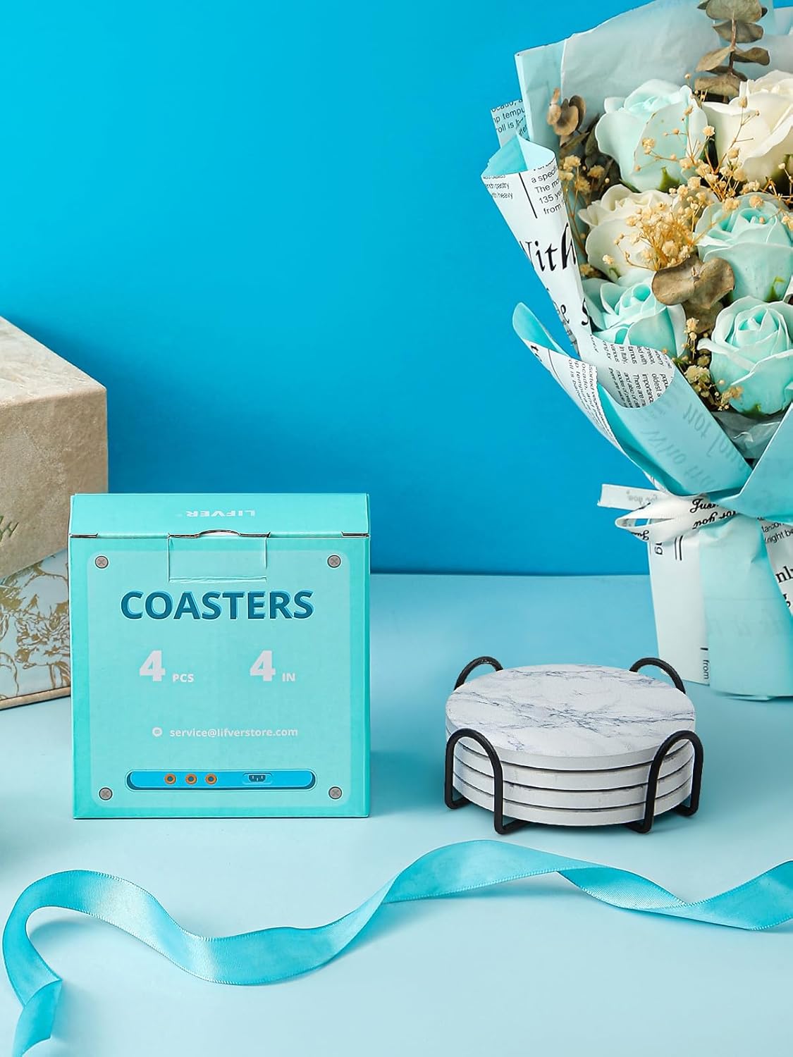 LIFVER Absorbent Coaster Sets of 4, Drink Coasters with Holder, White Marble Style Ceramic Drink Coaster for Tabletop Protection, Suitable for Kinds of Cups and Wooden Table, Cool Home Decor, 4 Inches