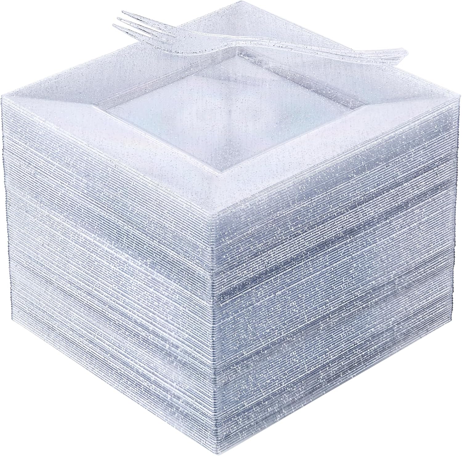 DaYammi 100Pcs Silver Dessert Plates Including 50Pcs Appetizer Plates 6",50Pcs Plastic Forks 5.7",Silver Glitter Plastic Square plate for Wedding,silver Salad plates and Cake Forks for Birthday Party