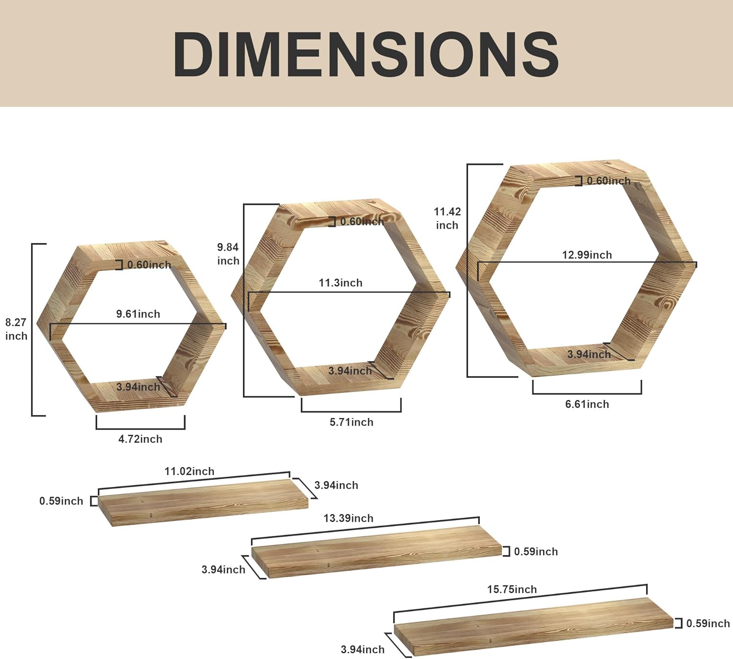 - ăSize PackageăYou can receive 3 different sizes of hexagonal shelves (large: 12.99*11.42*3.94 inches, medium: 11.3*9.84*3.94 inches, small: 9.61*8.27*3.94 inches) and 3 different sizes of floating shelves (large: 15.75*3.94*0.59 inches, medium: 13.39*3.94*0.59 inches, small: 11.02*3.94*0.59 inches). If there is any problem or dissatisfaction, please do not hesitate to let us know and we will try our best to solve your problem.