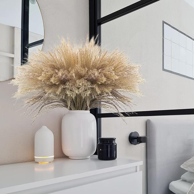 - Whispy array of flowers: Natural Dried Pampas Grass is taken from nature. Natural dried, No chemical additives, Non-toxic, and harmless. The soft dried flowers are like feathers remain beautiful year after year!