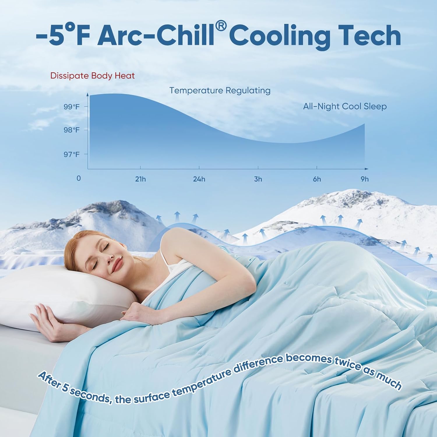 - KEEP YOUR COOL ALL NIGHT, even in warm and hot summer — Elegear cooling blanket uses Japanese Q-Max 0.5 Arc-Chill 3.0 Cooling Fibers to brilliantly absorb body heat, reduce skin temperature by 4 to 9°F instantly. (Other cooling fibers only have a cooling value of 0.2), make you cool without perspiration the whole night. This is a revolutionary design, especially for night sweats. Use our cooling comforter WITH AIR CONDITIONING, you will enjoy a comfortable and cool night without perspiration.
