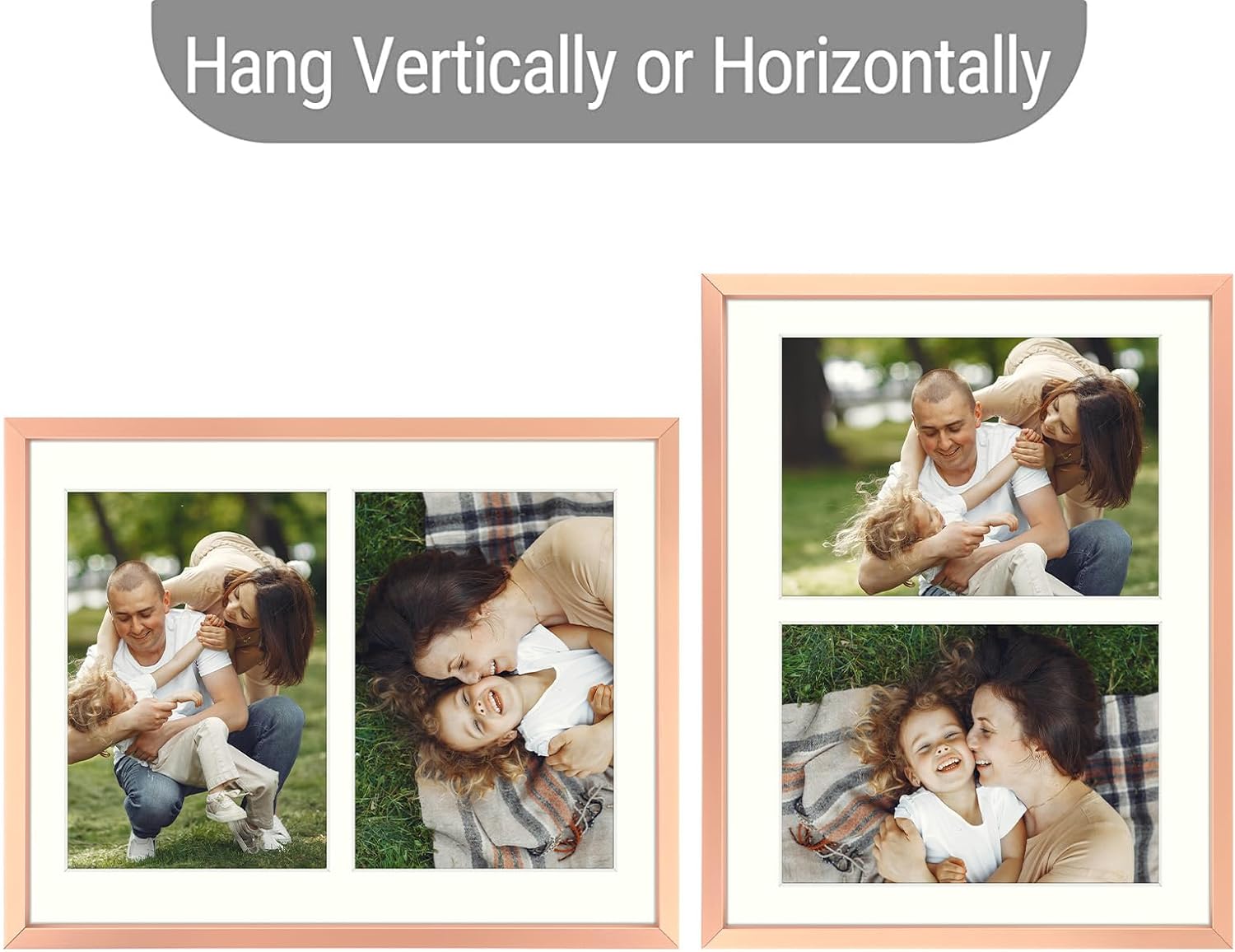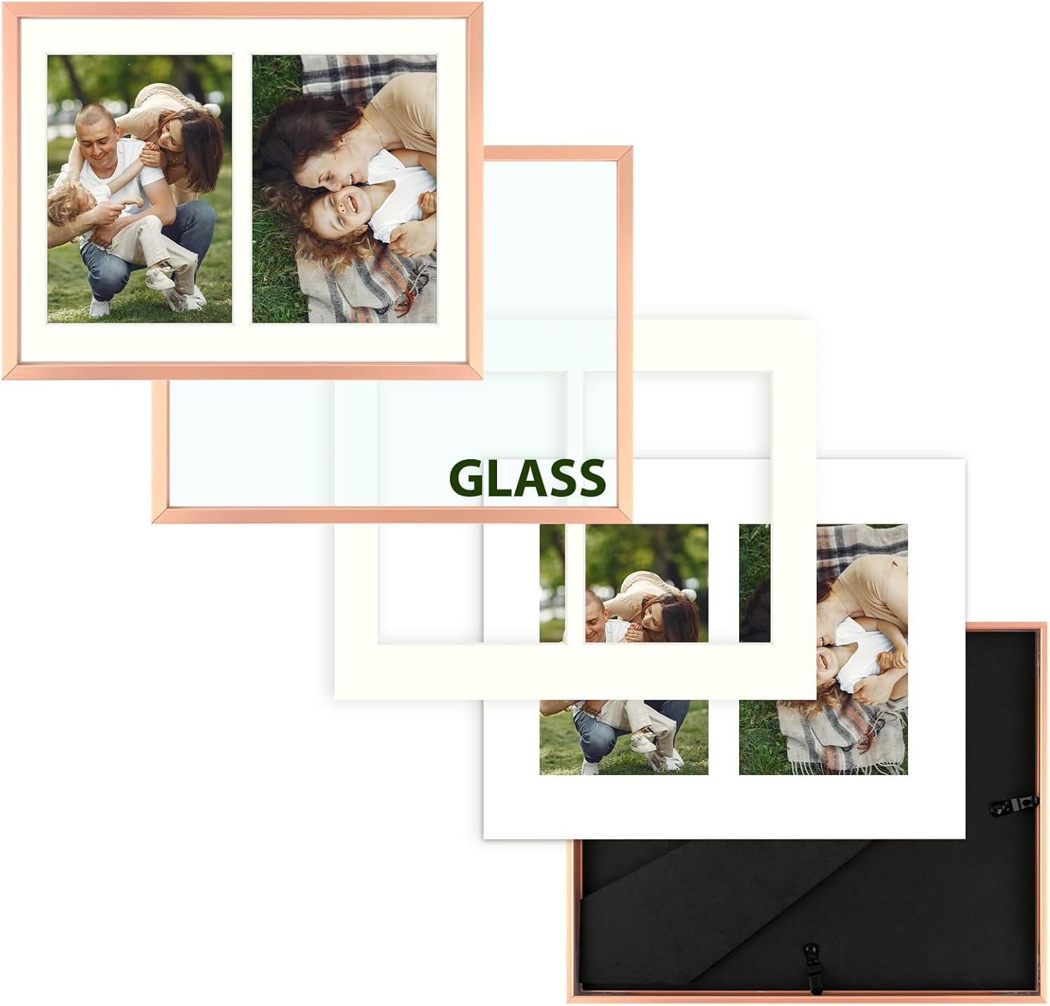 Frametory - 8.5x11 Aluminum Collage Picture Frame - Display 5x7 Pictures with 2 Openings Mat - Real Glass Front - with Easel Stand for Horizontal/Vertical Wall Mount - Rose Gold 1 Pack