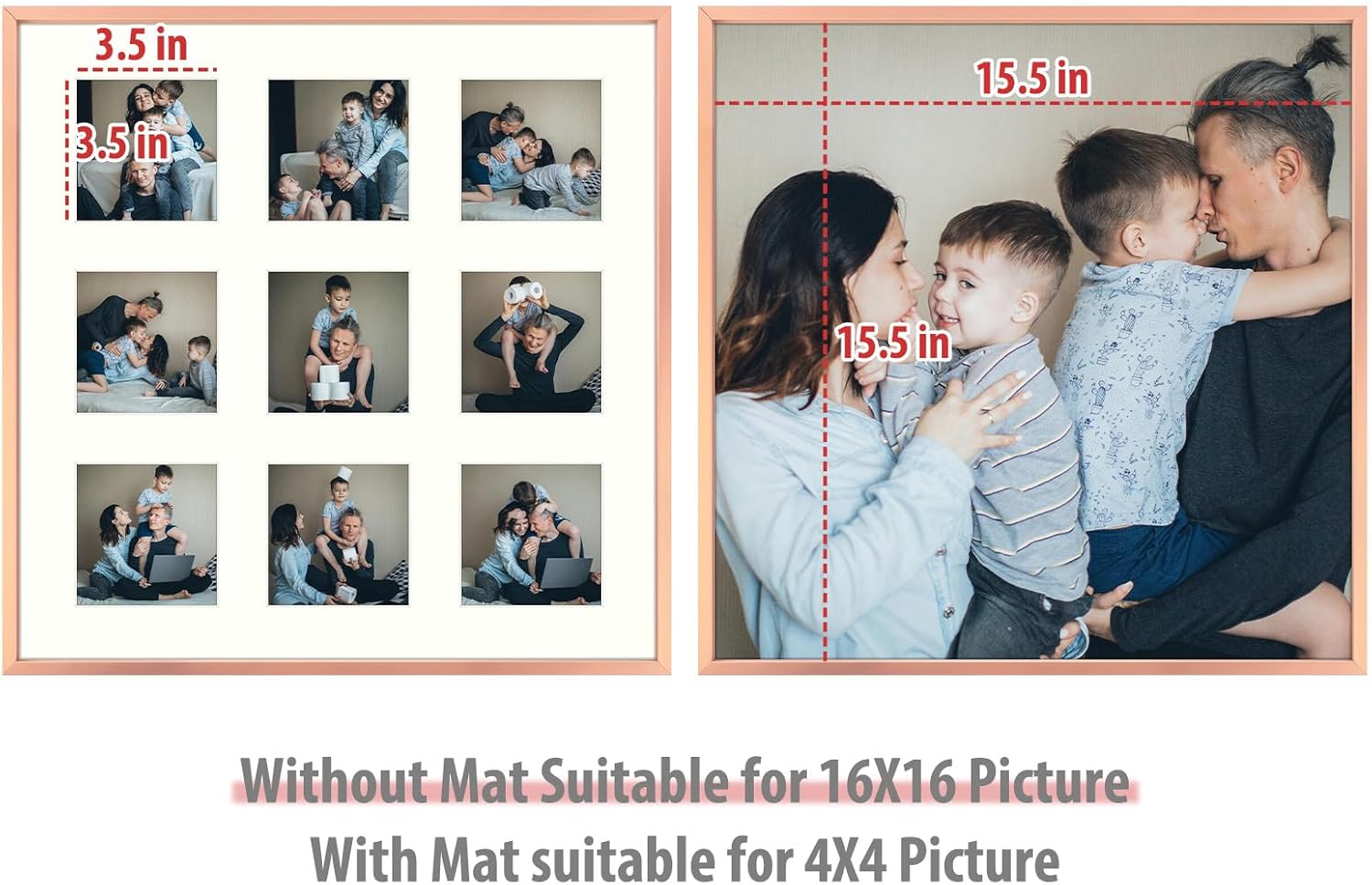- Usage: The 16x16 Metal Photo Frame with 9 Slots Mat For 4x4 Inch Collage Pictures. Great Gifts For Christmas, Birthday, Anniversary, Housewarming, Mother's Day, Father's Day and Other Kinds of Festival