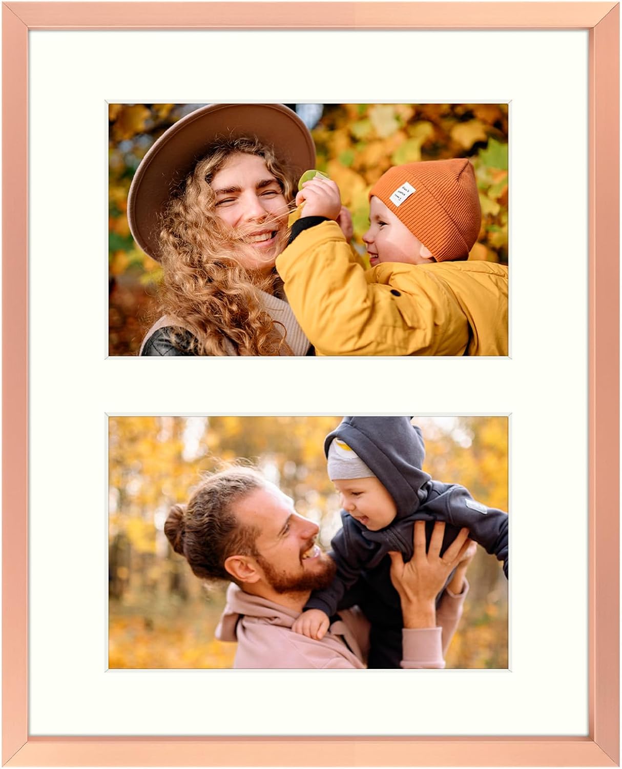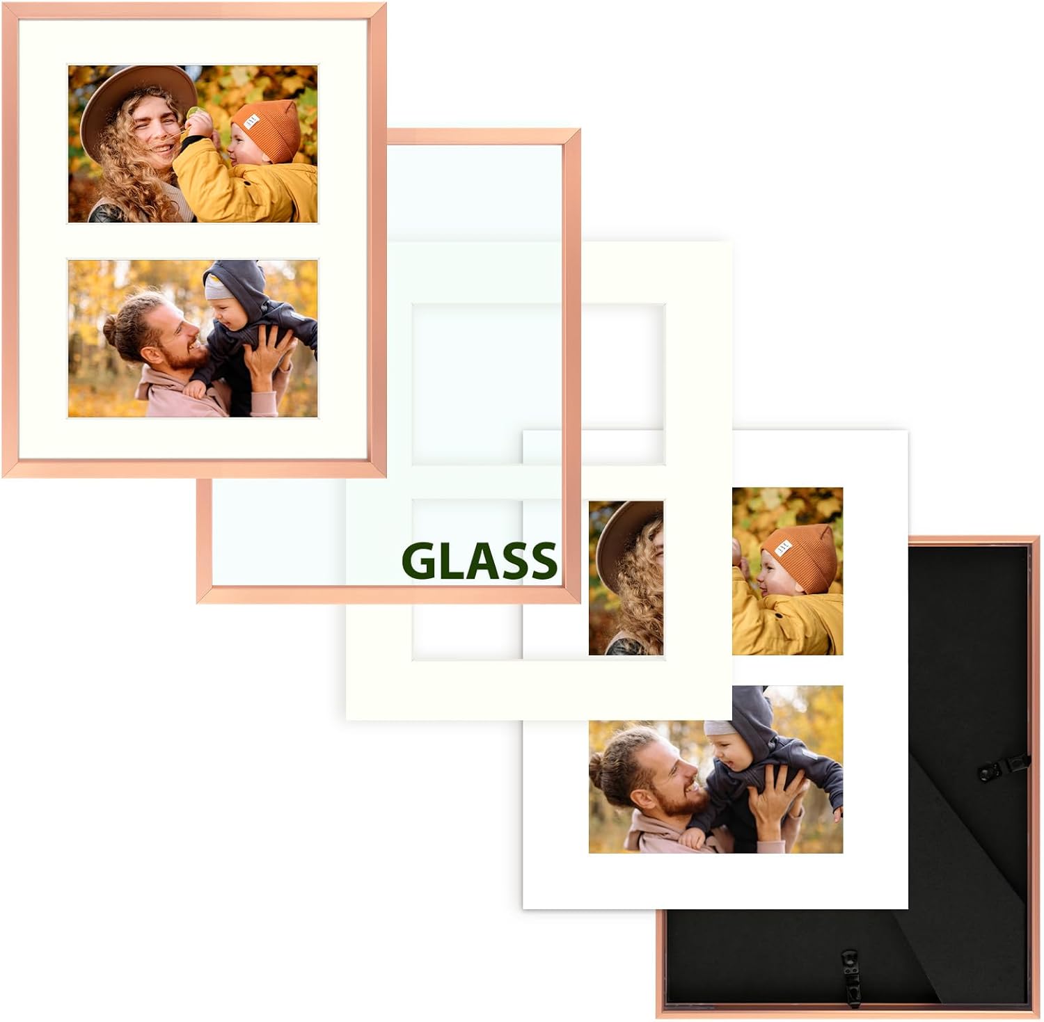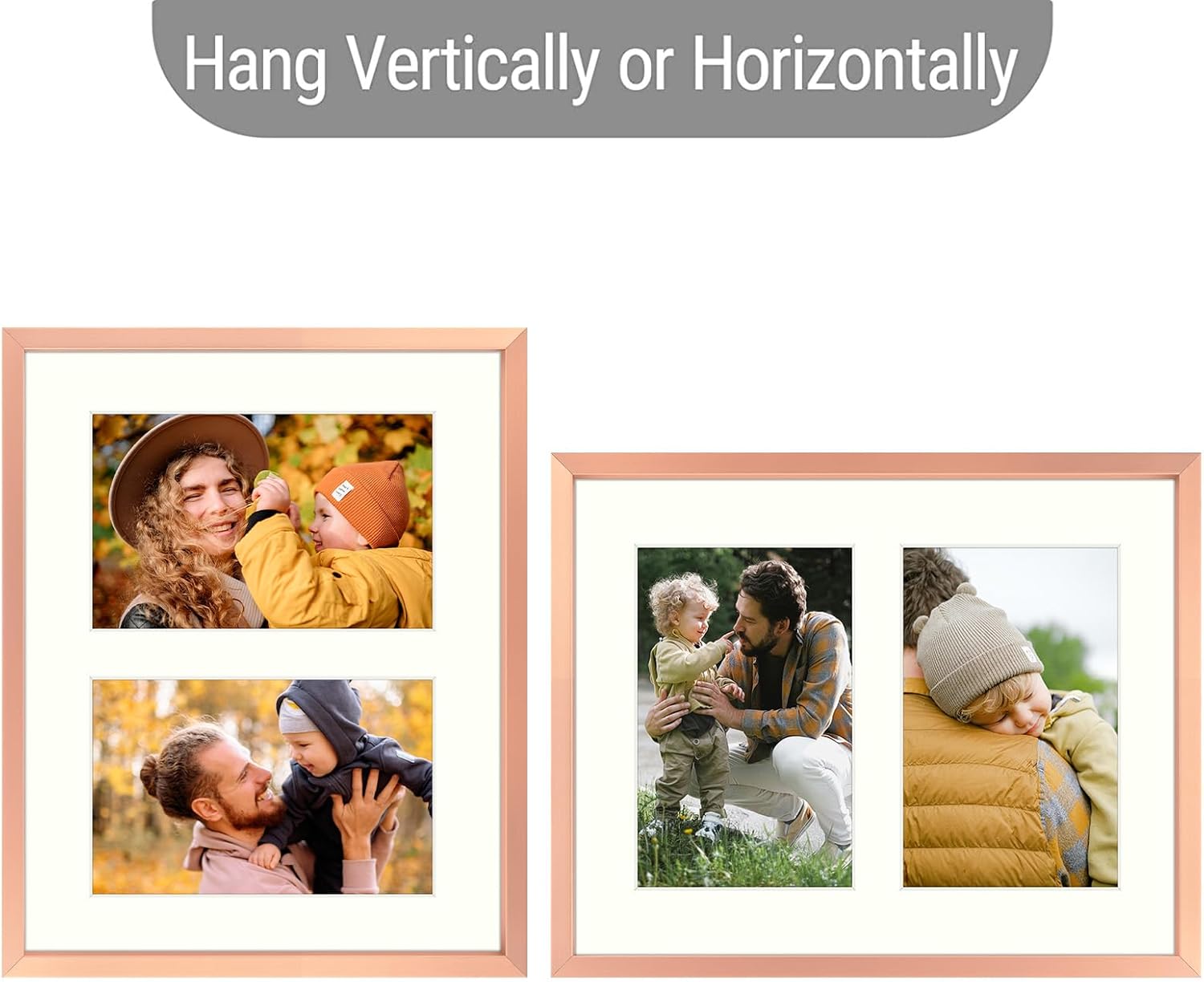 Frametory - 8x10 Aluminum Collage Picture Frame - Display 4x6 Pictures with 2 Openings Mat - Real Glass Front - with Easel Stand for Horizontal/Vertical Wall Mount - Rose Gold 1 Pack