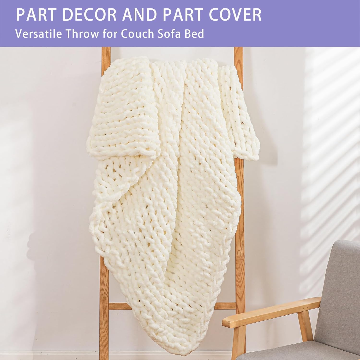 Bigacogo Chunky Knit Throw Blanket for Couch, 80x90 inches, 100% Hand Knitted with Thick Jumbo Chenille Yarn, Cozy Soft Large Rope Knot Cable Crochet Blankets for Sofa Bed Living Room, Ivory