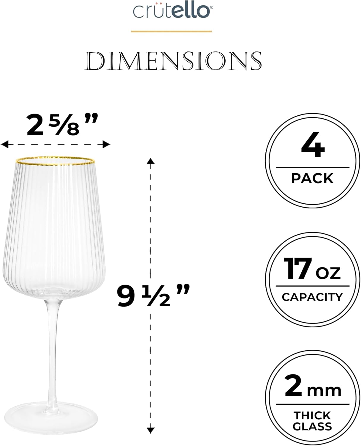Crutello Modern Wine Glasses - 17 oz Unique Fluted Glassware with Vintage Ribbed Glassware Texture and Gold Rim, Art Deco Red or Fancy White Wine Glasses - Set of 4