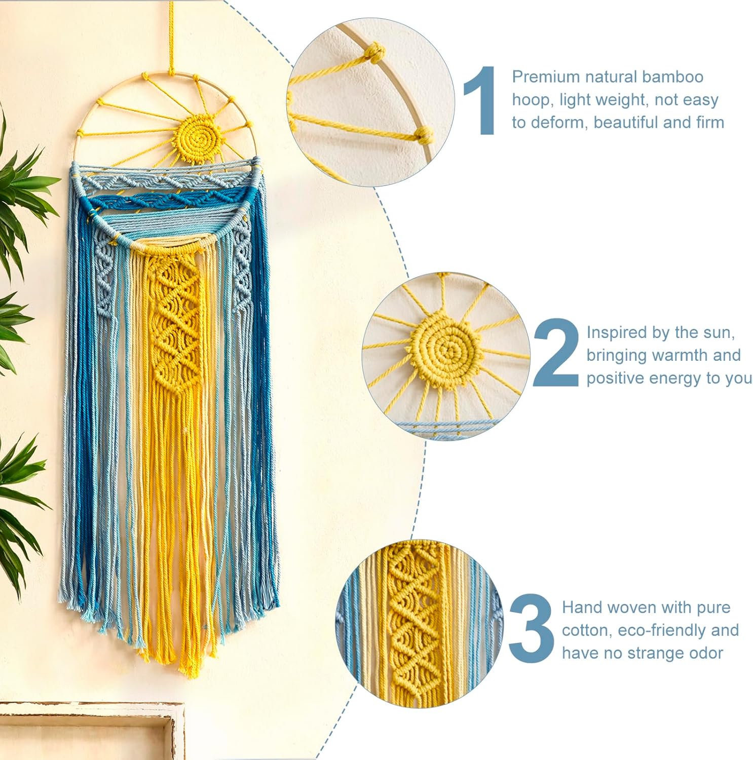 - POSITIVE SYMBOLISM - This macrame tapestry is the perfect boho wall hanging decor serves as a symbol of protection and positive energy. Inspired by the sun, waves, and beach, symbolizing warmth and healing, firm and indomitable, stability and tolerance. Decorate your room with a beautiful piece of sun wall art, bring your dream of an endless summer and will bring sunshine to any space