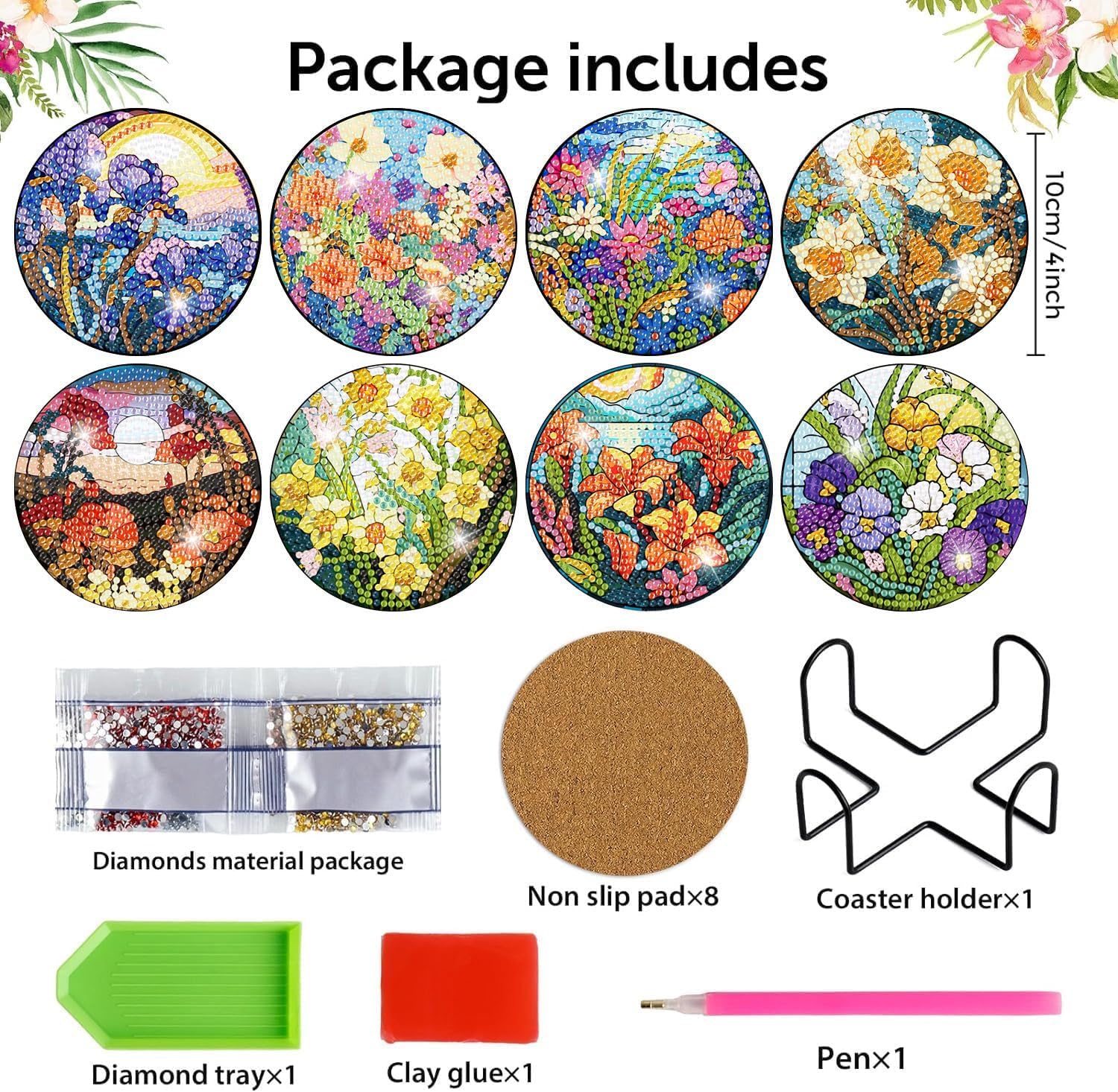 - 【Flower diamond art coaster set】You will get 8 flower diamond art coasters,including 1 coaster holder,1 diamond pen,1 diamond tray,1 clay glue and enough quantity of molded diamonds,cute and shiny home decorations.