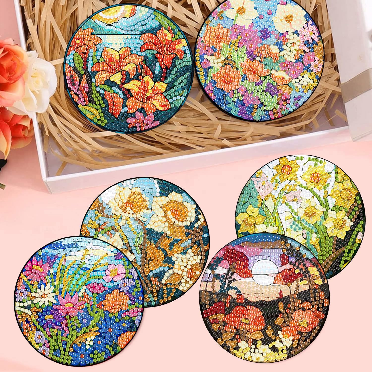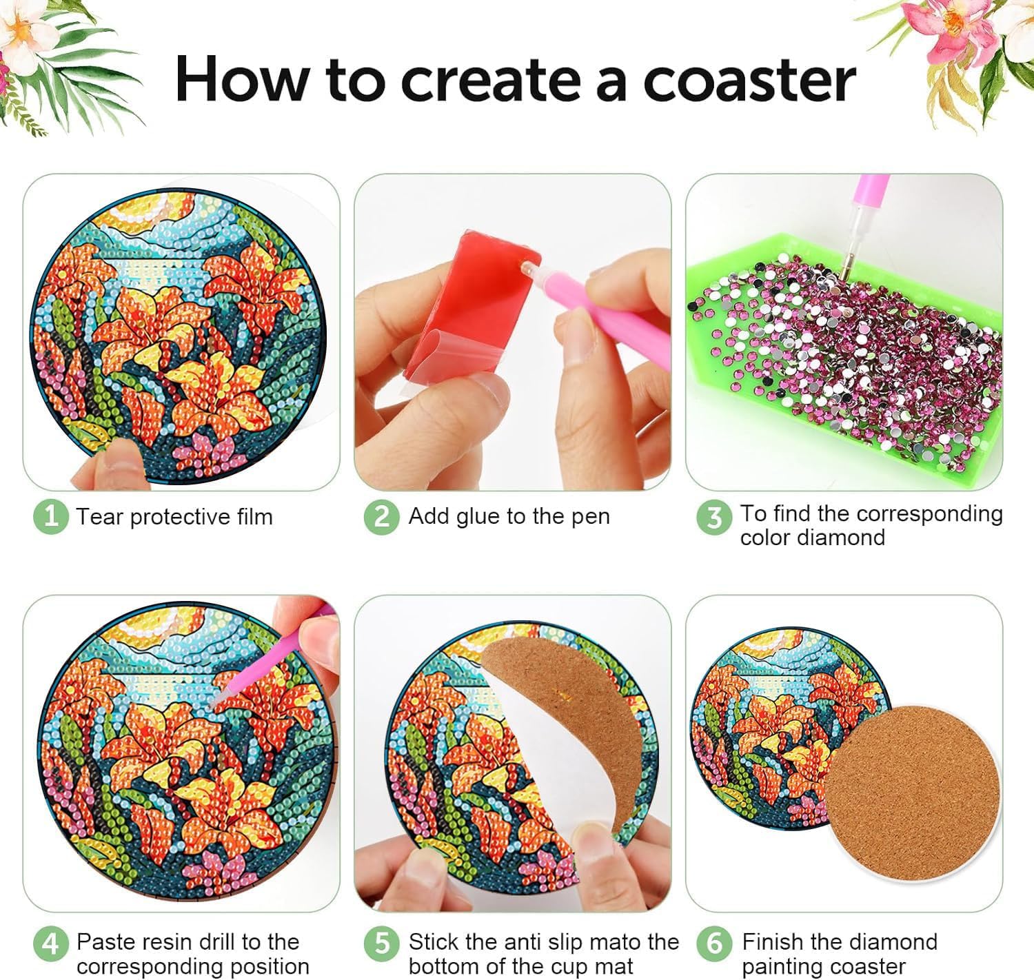 - 【Easy to apply】This set of flower-themed drink coasters is very easy to use.Pour your the diamonds that corresponds to the number on the coaster into the tray,then peel off the film covering the coaster and stick the corresponding diamonds on the coaster according to the number on the coaster.Finally,a unique and beautiful flower coaster is done.