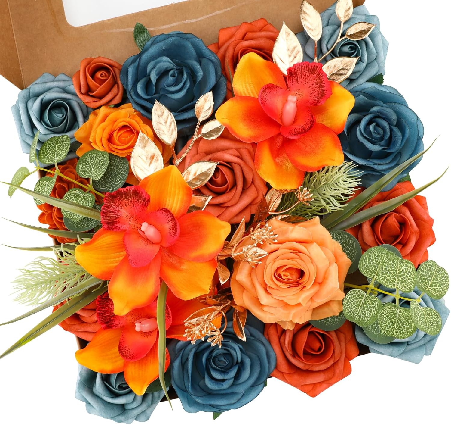 - ♔ORANGE ARTIFICIAL FLOWERS COMBO-Floweroyal faux flower set contains roses, eucalyptus, wild flowers and other accessories. All comes in a very cute box, easy giftable item.