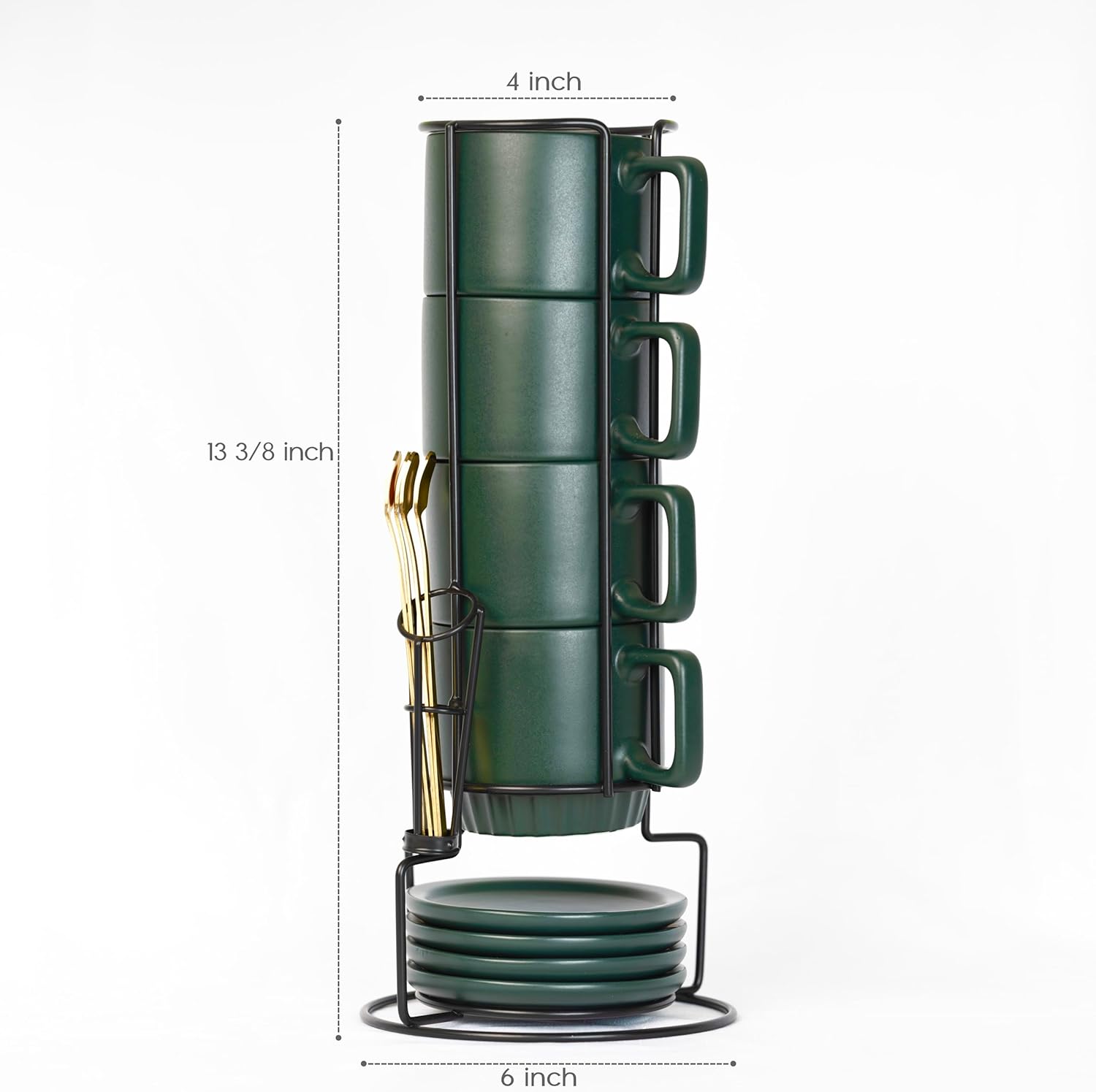 Coffee Mug Set of 4-11.5 Oz Porcelain Stackable Coffee Mugs with Saucers, Spoons & Metal Stand - Ceramic Tea Cups with Rack - Dishwasher & Microwave Safe