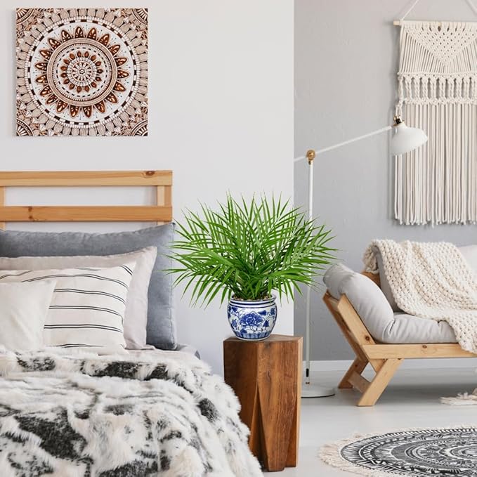 - Chinoiserie Planters: This palm faux plant potted total height about: 16 inches, blue and white porcelain planter: 5.5 inches wide x 4.7 inches high, the vase made of superior high temp fired ceramic, vibrant blue and white color with exquisite floral pattern design