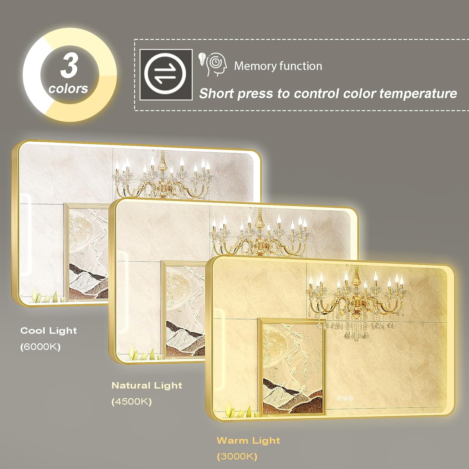 - 【Dimmable LED Mirror】This gold LED bathroom mirror has adjustable brightness and color temperature. Long press the light button to adjust the brightness from 10% to 100%. Short press the light button to set warm/natural/cold lighting. The memory function will automatically remember the last settings