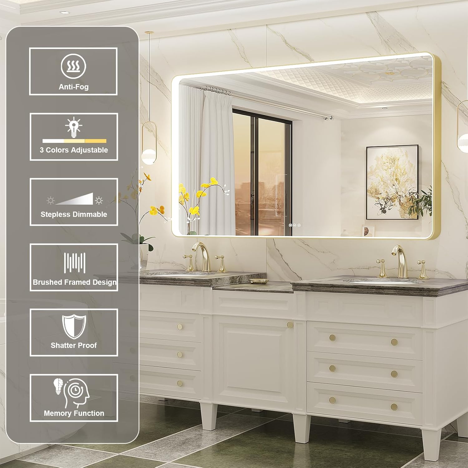 LED Mirror for Bathroom 60X36 Inch Gold Framed with Anti-Fog, Stepless Dimmable, Front Lit, LED Bathroom Vanity Mirror for Wall, Memory Function, Shatter-Proof