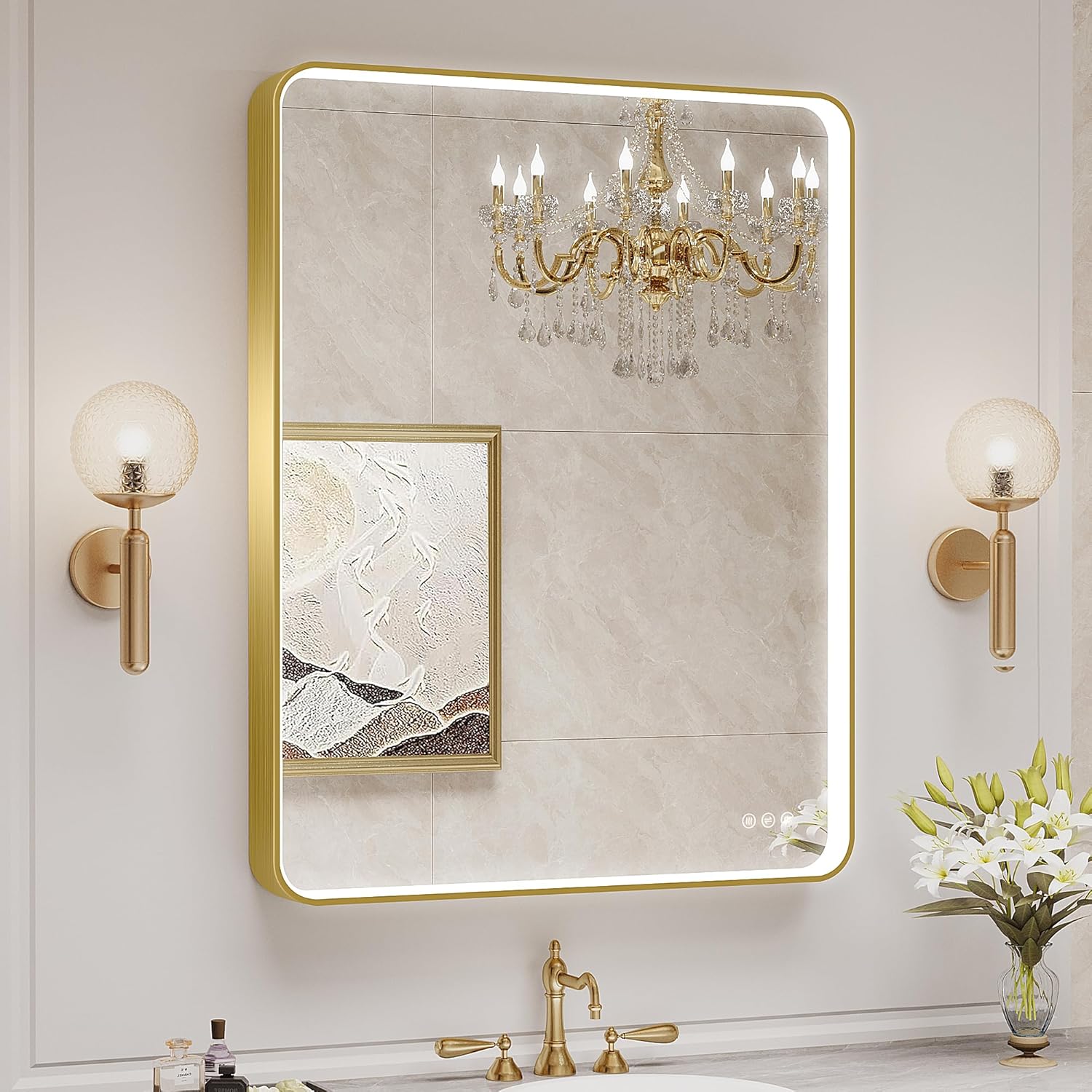 LED Mirror for Bathroom 28X36 Inch Gold Framed with Anti-Fog, Stepless Dimmable, Front Lit, LED Bathroom Vanity Mirror for Wall, Memory Function, Shatter-Proof