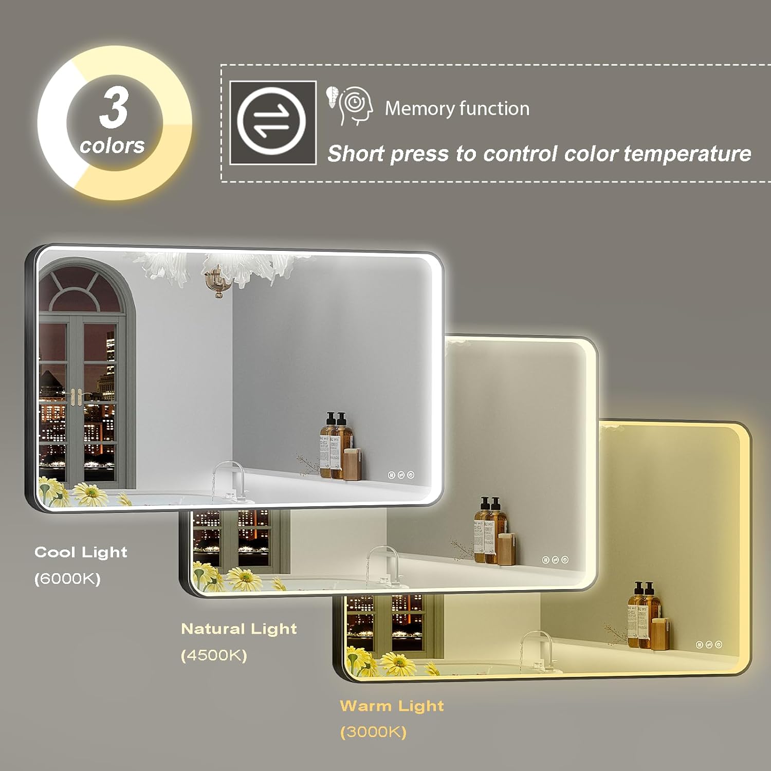- 【Dimmable LED Mirror】This black LED bathroom mirror has adjustable brightness and color temperature. Long press the light button to adjust the brightness from 10% to 100%. Short press the light button to set warm/natural/cold lighting. The memory function will automatically remember the last settings