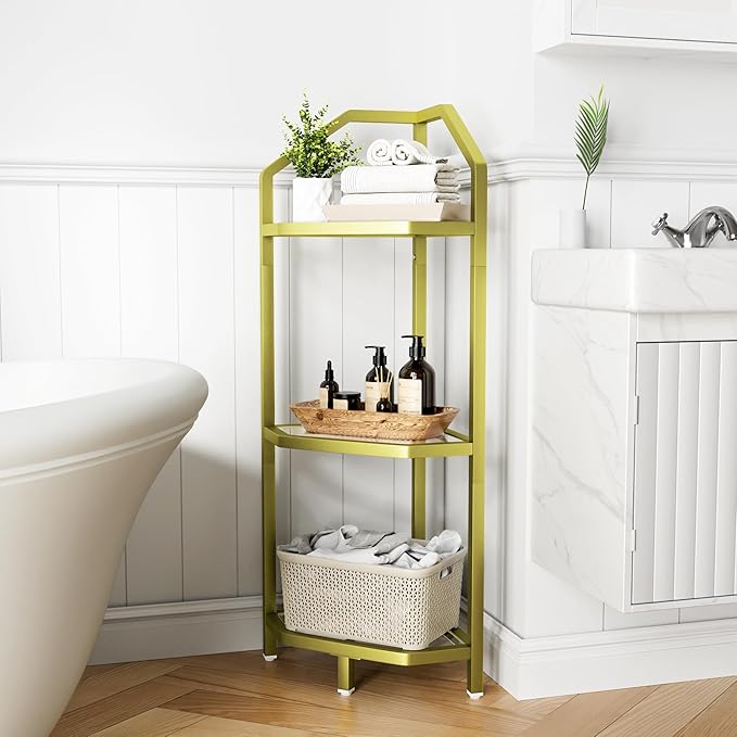 3-Tier Corner Shelf Stand, Gold Corner Bookshelf, Bathroom Storage Rack Shelf, Plant Rack, Tempered Glass, Steel Frame, Modern Style for Living Room, Bathroom, Kitchen, Metallic Gold
