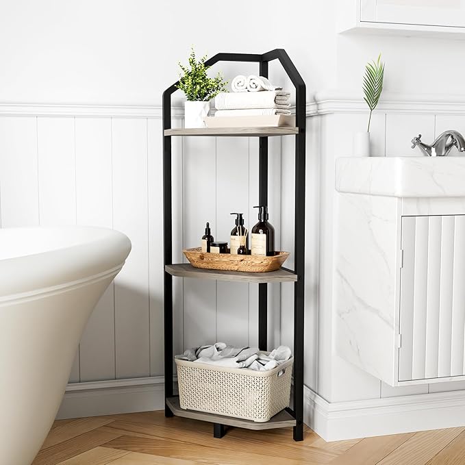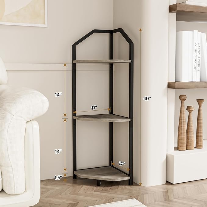 Fun Memories 3 Tier Corner Shelf, 40” Corner Shelf Stand, Corner Bookshelf Plant Stand, Storage Shelf for Bathroom, Living Room, Kitchen,Grey Home Office, Grey