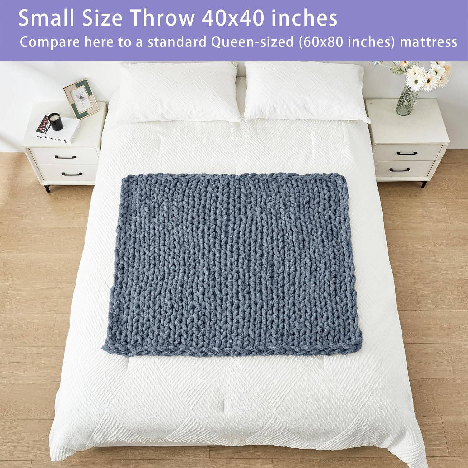 Bigacogo Chunky Knit Throw Blanket for Couch, 40x40 inches, 100% Hand Knitted with Thick Jumbo Chenille Yarn, Cozy Soft Large Rope Knot Cable Crochet Blankets for Sofa Bed Living Room, Cold Sea Blue