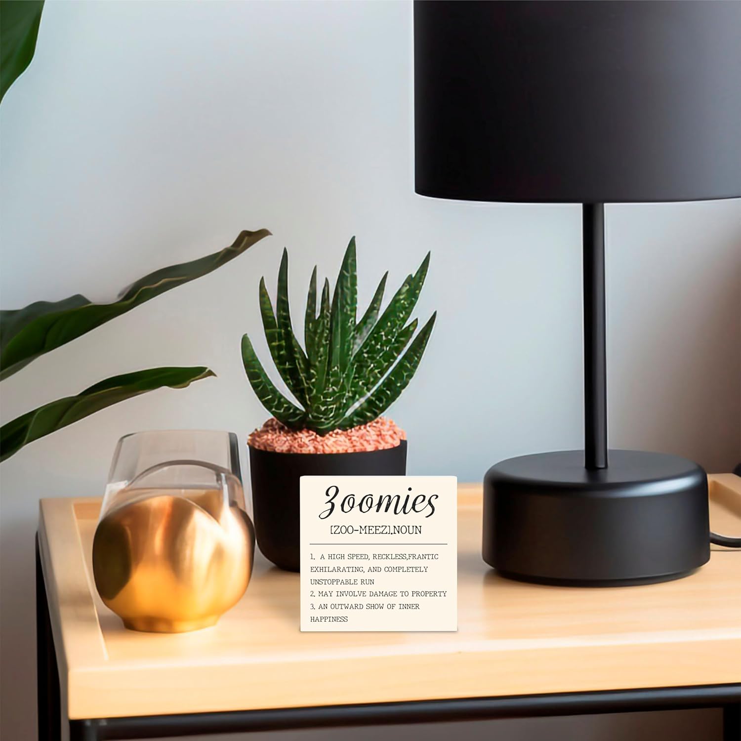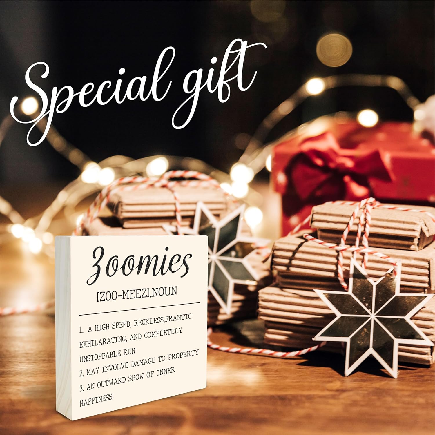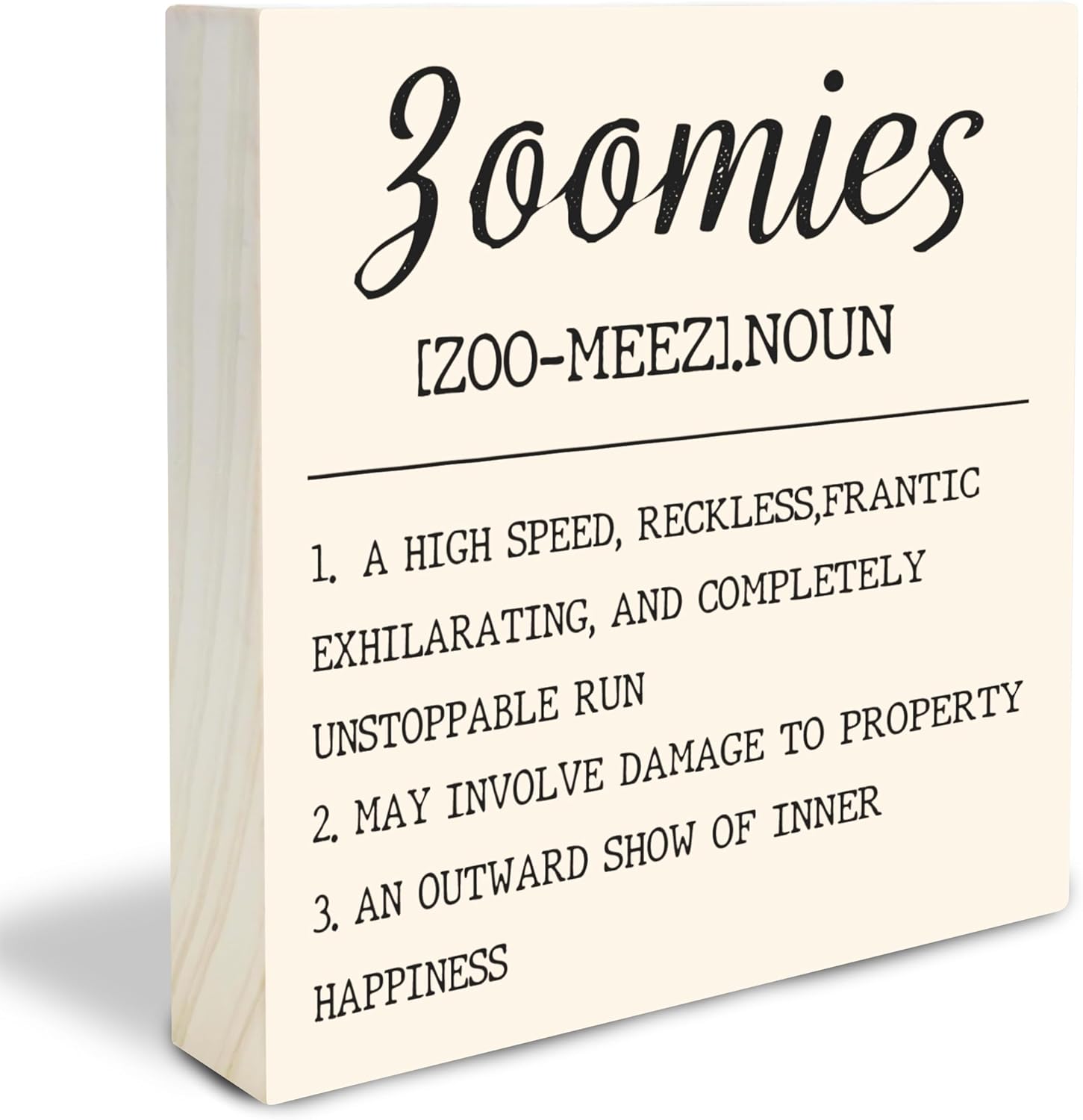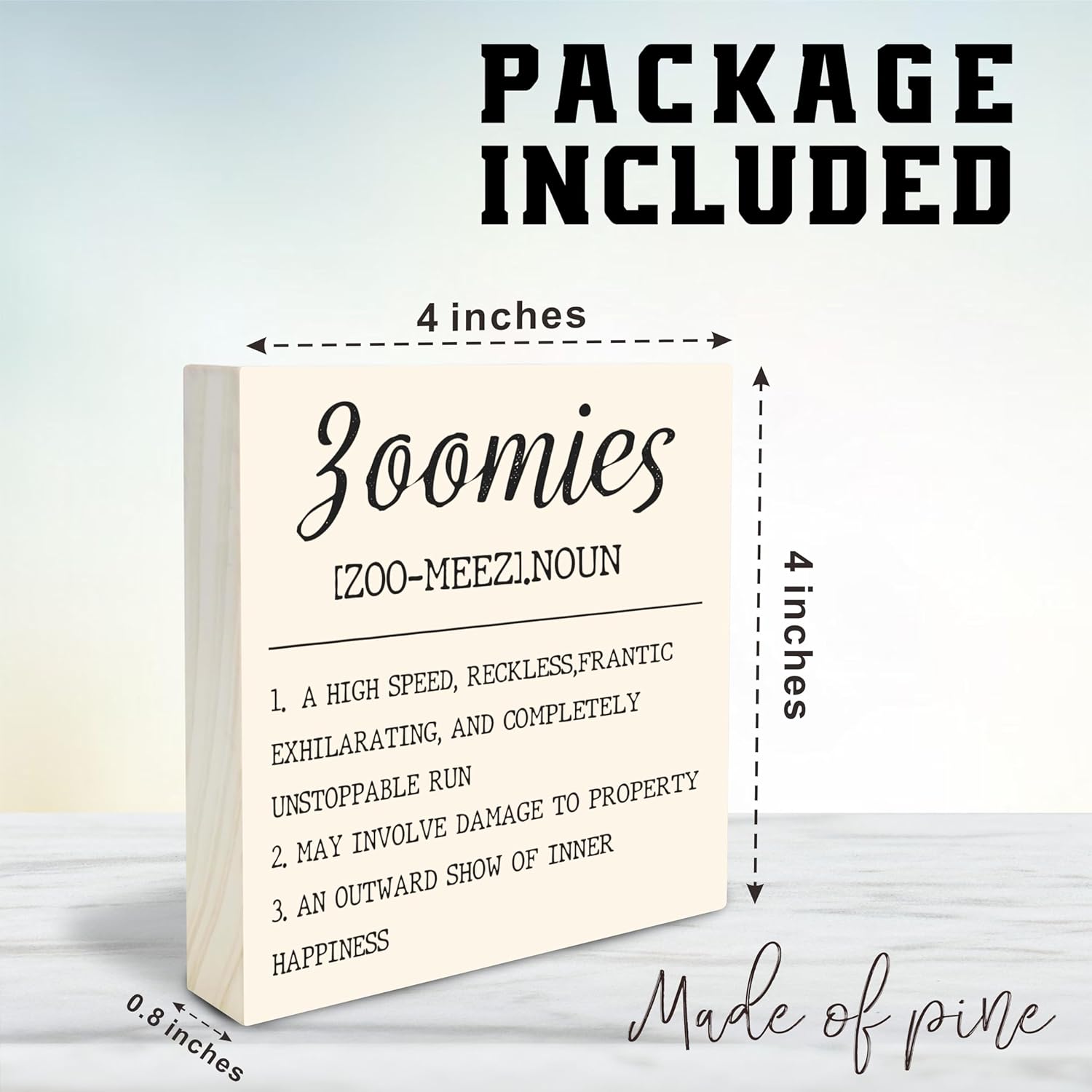 Dog Theme Wooden Block Sign - Zoomies - 4"X4" Decorative Pine Wood Plaque, Home & Office Desk Decor, Dog Lover Gift, Room Tabletop, Shelf Accessories (Khaki) - A03