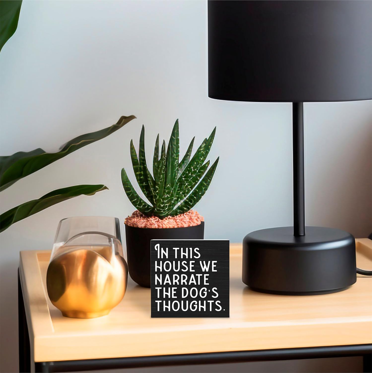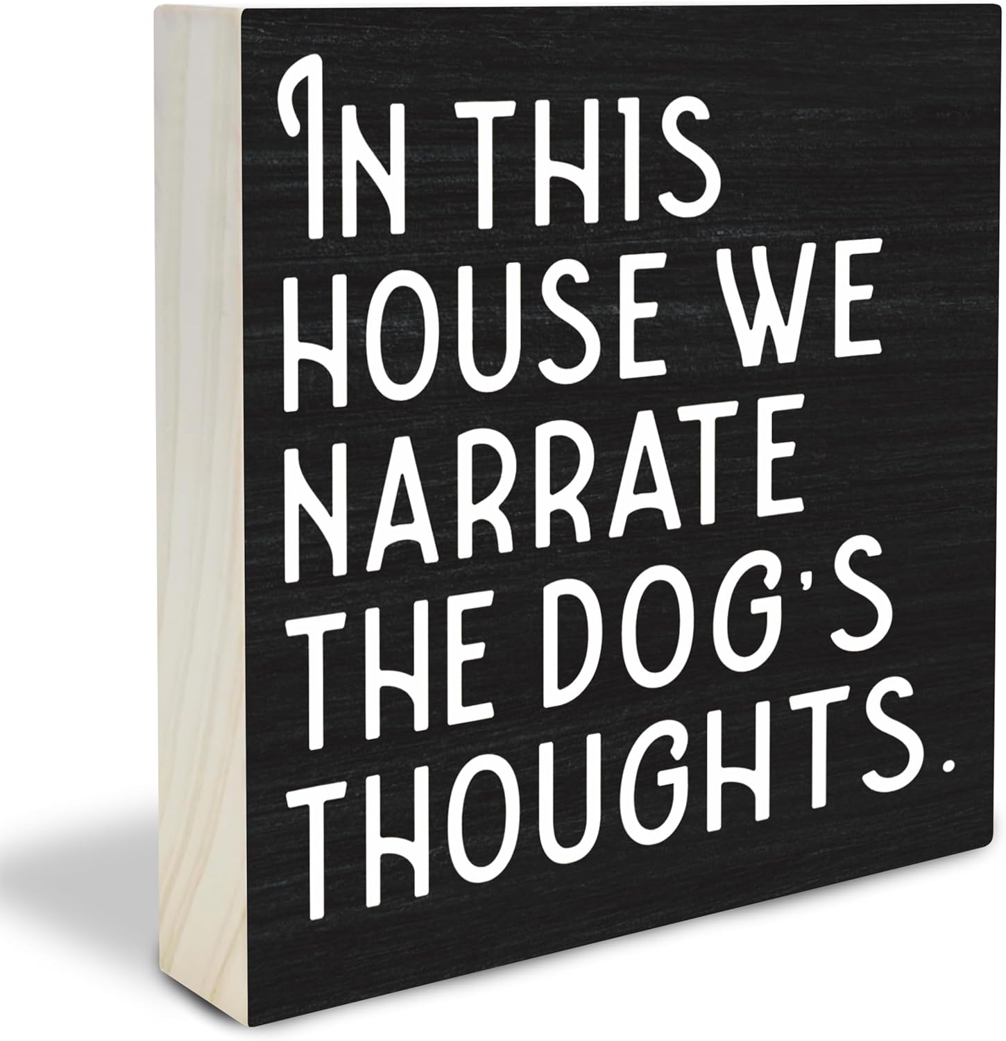 Dog Theme Wooden Block Sign - In This House We Narrate The Dog's Thoughts - 4"X4" Decorative Pine Wood Plaque, Home & Office Desk Decor, Dog Lover Gift, Room Tabletop, Shelf Accessories (Black) - A01