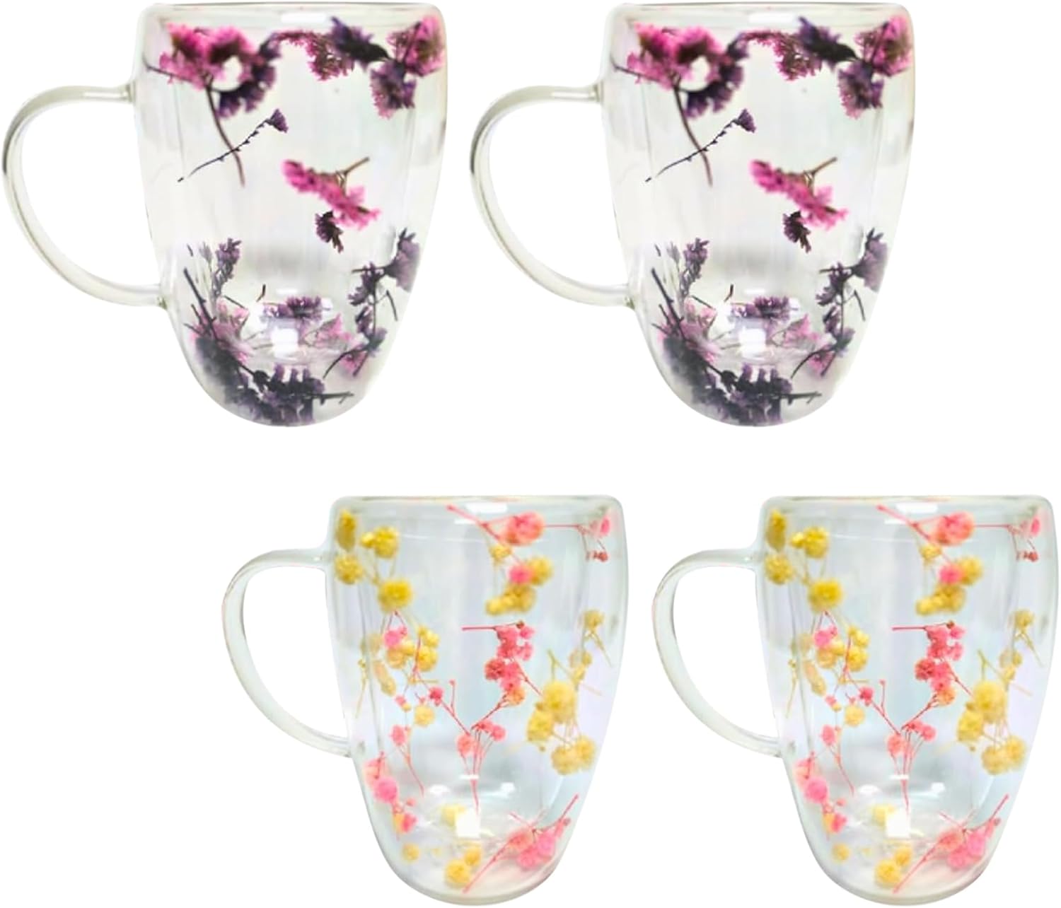 - Elegant Flower Design: Elevate your everyday dining with our sophisticated, meticulously designed set of 4 double wall mug with 2 x pink white and 2 x purple dried flower, perfect for enhancing any table setting with unique visual appeal.