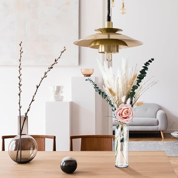 - Quality Material: our pampas grass is beautifully textured and warm in color, which will become more fluffy and supple after a few hours in the sun; Artificial roses are made of quality materials and have natural colors, giving your space a natural appearance; Made of quality glass, the glass vases are safe and clear, and the linen rope is reliable and durable