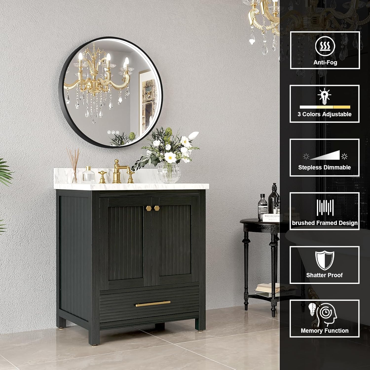 LED Bathroom Mirror with Black Framed 24 Inch, LED Mirror for Bathroom with Anti-Fog, Stepless Dimmable, Front Lit, Memory Function, Shatter-Proof