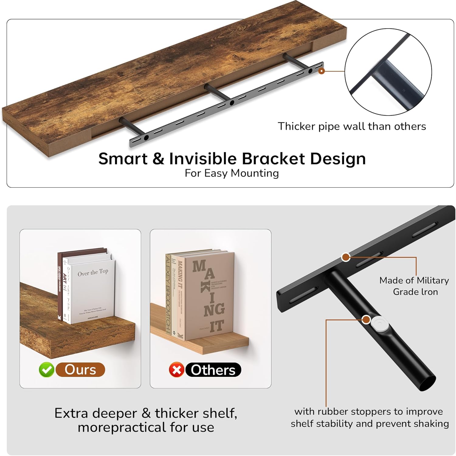 - Easy To Assemble - This floating shelves come with stainless-steel galvanized invisible brackets, toggle bolts for drywall & a simple instruction manual to help you install. The assembly of this wall shelf is very simple, only two boards and some necessary screws and other hardware, and we also have detailed instructions for you to view, you can assemble quickly. Please contact our product support team when you have any questions.
