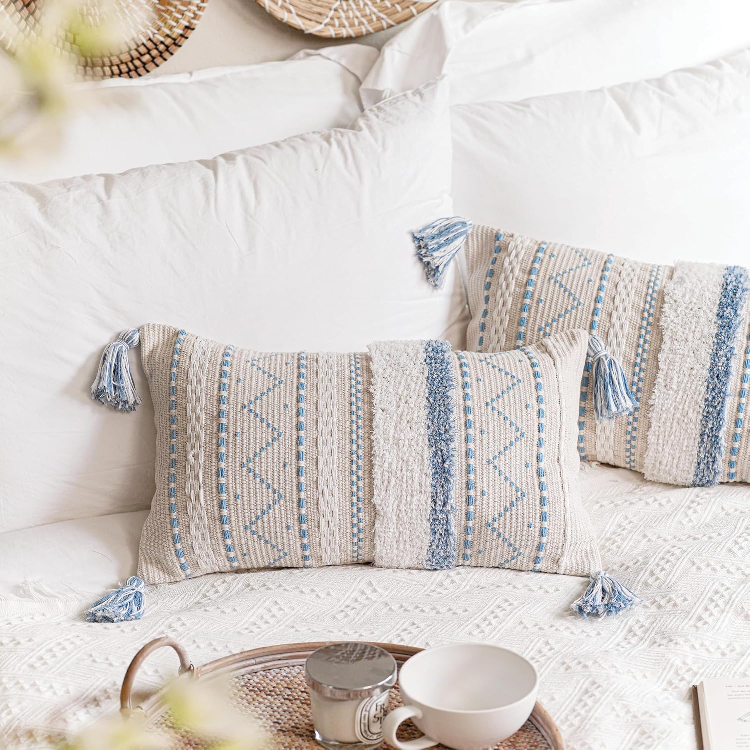 BlissBlush Blue Decorative Lumbar Throw Pillow Cover 12x20 Rectangular Boho Accent Pillowcase Neutral White Farmhouse Cushion for Couch Sofa Bedroom Living Home Décor (Cover ONLY, Pack of 1)
