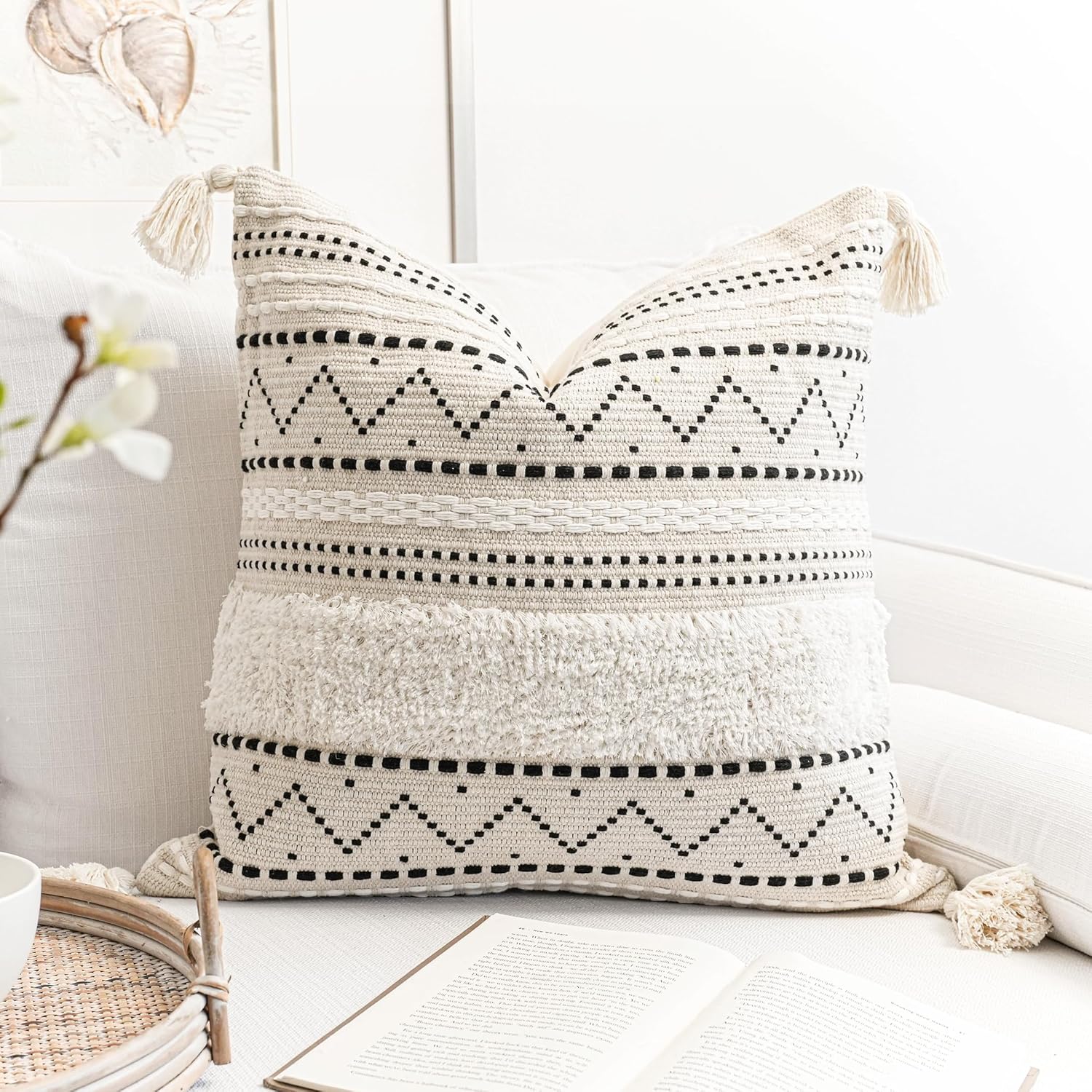 BlissBlush Decorative Throw Pillow Cover 20x20 Square Boho Black Neutral White Accent Pillowcase Tassels Farmhouse Cushion for Couch Sofa Bedroom Living Room Home Décor (Cover ONLY, Pack of 1)