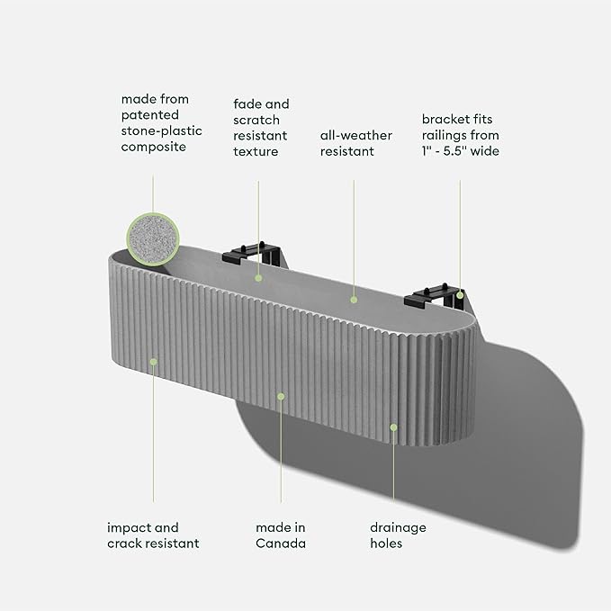 • DURABLE MATERIAL: Made from a plastic-stone composite, this railing planter box has a subtle textured finish and is all-weather resistant to cracks, scratches, UV and fading; perfect for hot or cold climates ranging from -20 to +120 degrees