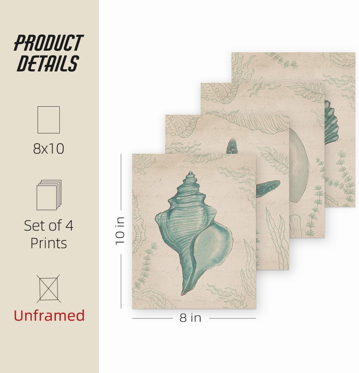 ETVISO Vintage Coastal Wall Art Set of 4, Bathroom Wall Decor, Starfish Seashell Conch Wall Decor, Ocean Theme Decor for Farmhouse Bathroom Coastal Kitchen, 8x10 (Unframed)