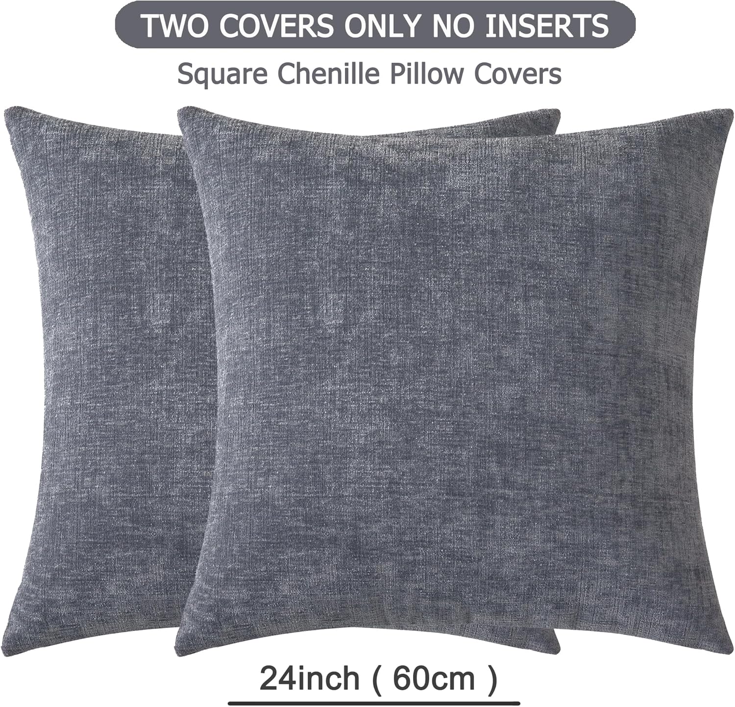 GAWAMAY Decorative Chenille Throw Pillow Covers 24x24 Inch Pack of 2, Soft Square Couch Pillow Cover for Sofa Cushion Living Room Bedroom Solid Dyed Pillowcases Grey 60x60cm (ONLY Covers)