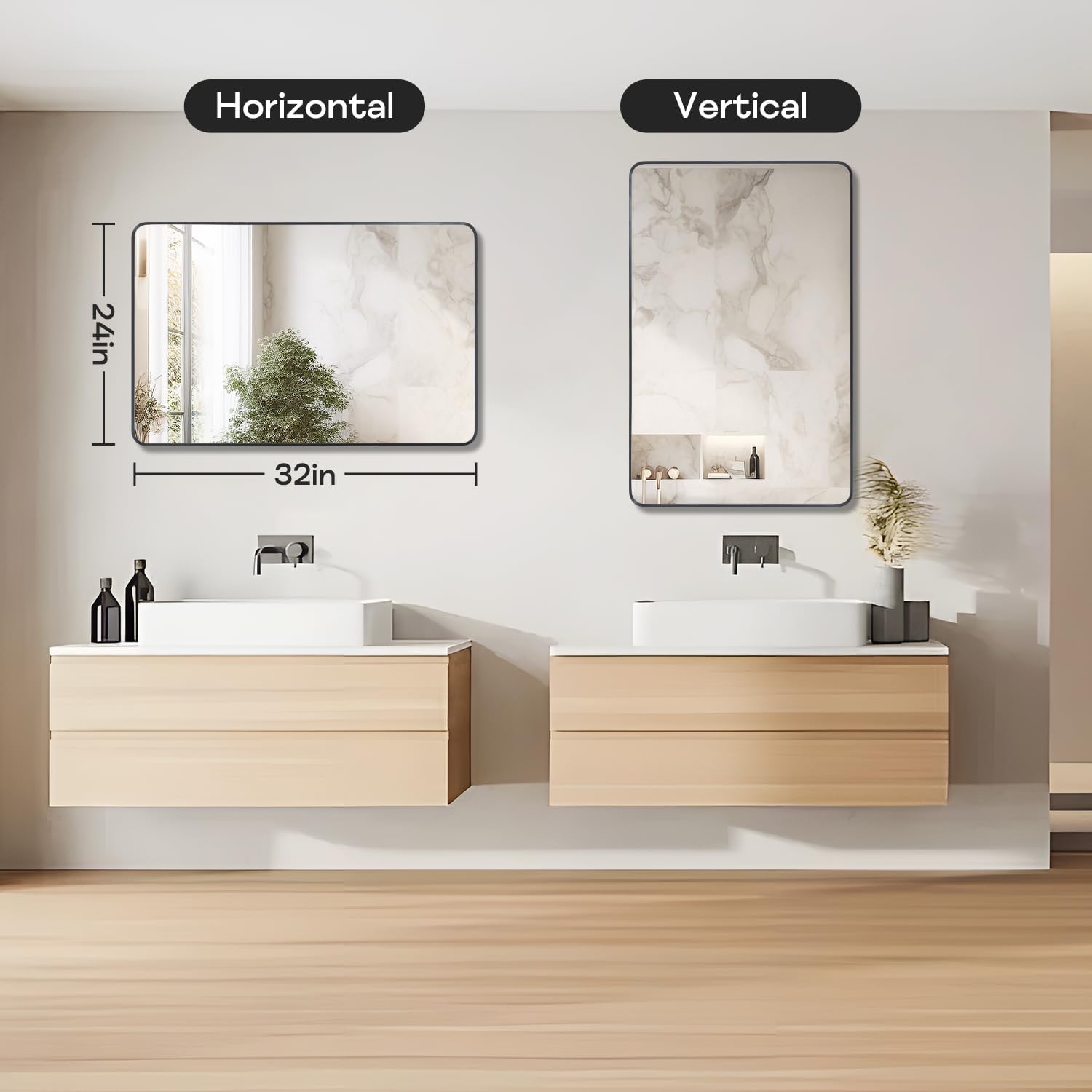Black Framed Bathroom Mirror for Wall, Matte Black Rounded Corner Rectangle Vanity Mirror, Brushed Frame, Tempered Glass, Anti-Rust, Hangs Horizontally or Vertically (24" x 32", Black)