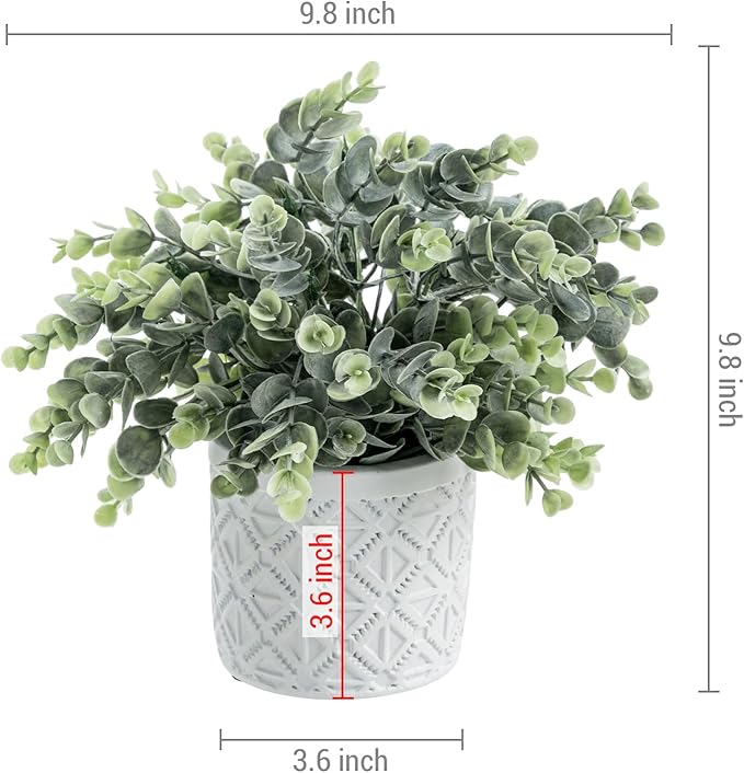 - Desktop artificial eucalyptus greenery potted plant with modern geometric embossed pattern concrete pot planter for your home, office or event settings