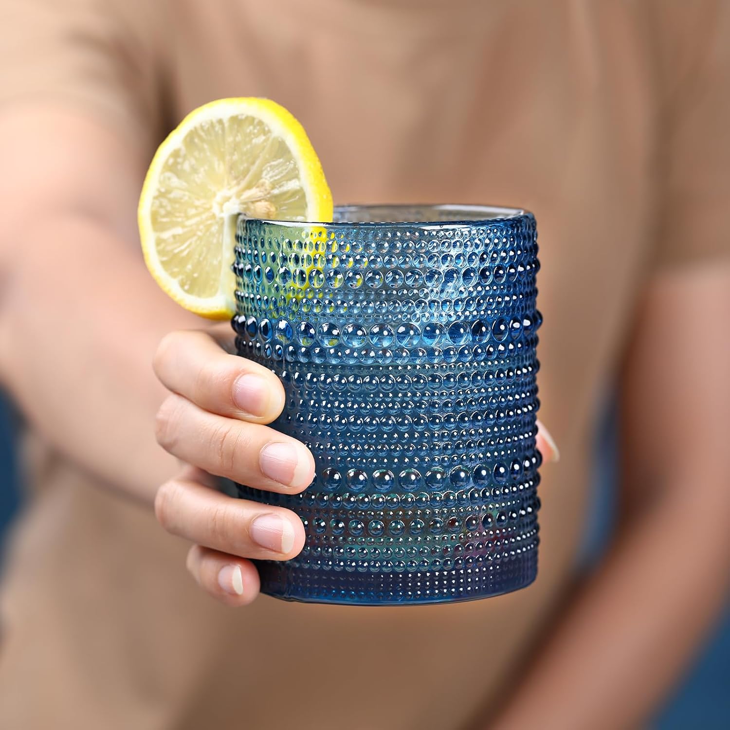 Hobnail Drinking Glasses Set of 6,12oz Blue Vintage Glassware,Cocktail Glasses,Embossed Glass Cups,Water Tumbler for Whiskey, Juice and Various Mixed Drinks