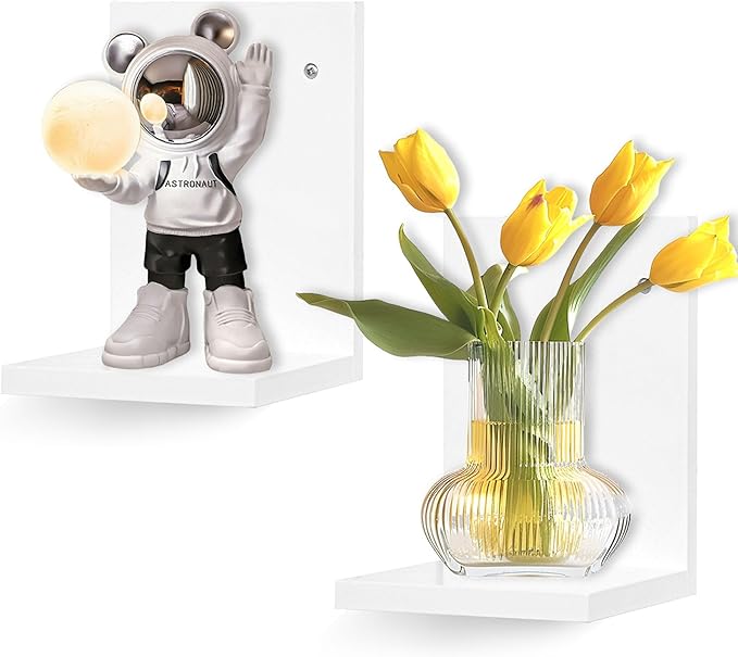 Small Wall Shelf,L-Shaped Small Floating Shelves for Plants Speaker Table Lamp Display,Wooden Ledges Indoor Modern Midcentury Decorative for Gallery Living Room Bedroom Porch,Pine,2 Pack(White)