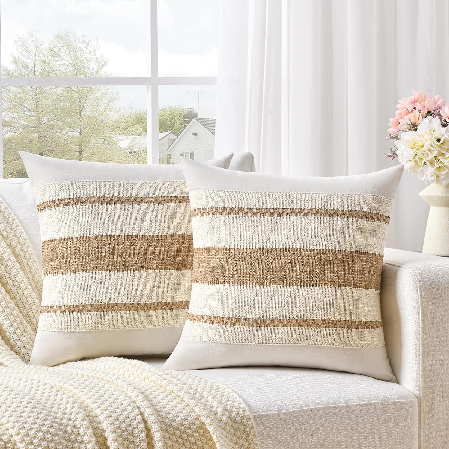 Fancy Homi Set of 2 Boho Neutral Decorative Throw Pillow Cover 20x20 Inch for Couch Bed Sofa, Aesthetic Modern Organic Farmhouse Home Decor, Soft Cotton Cute Accent Macrame Woven Tan Cushion Case