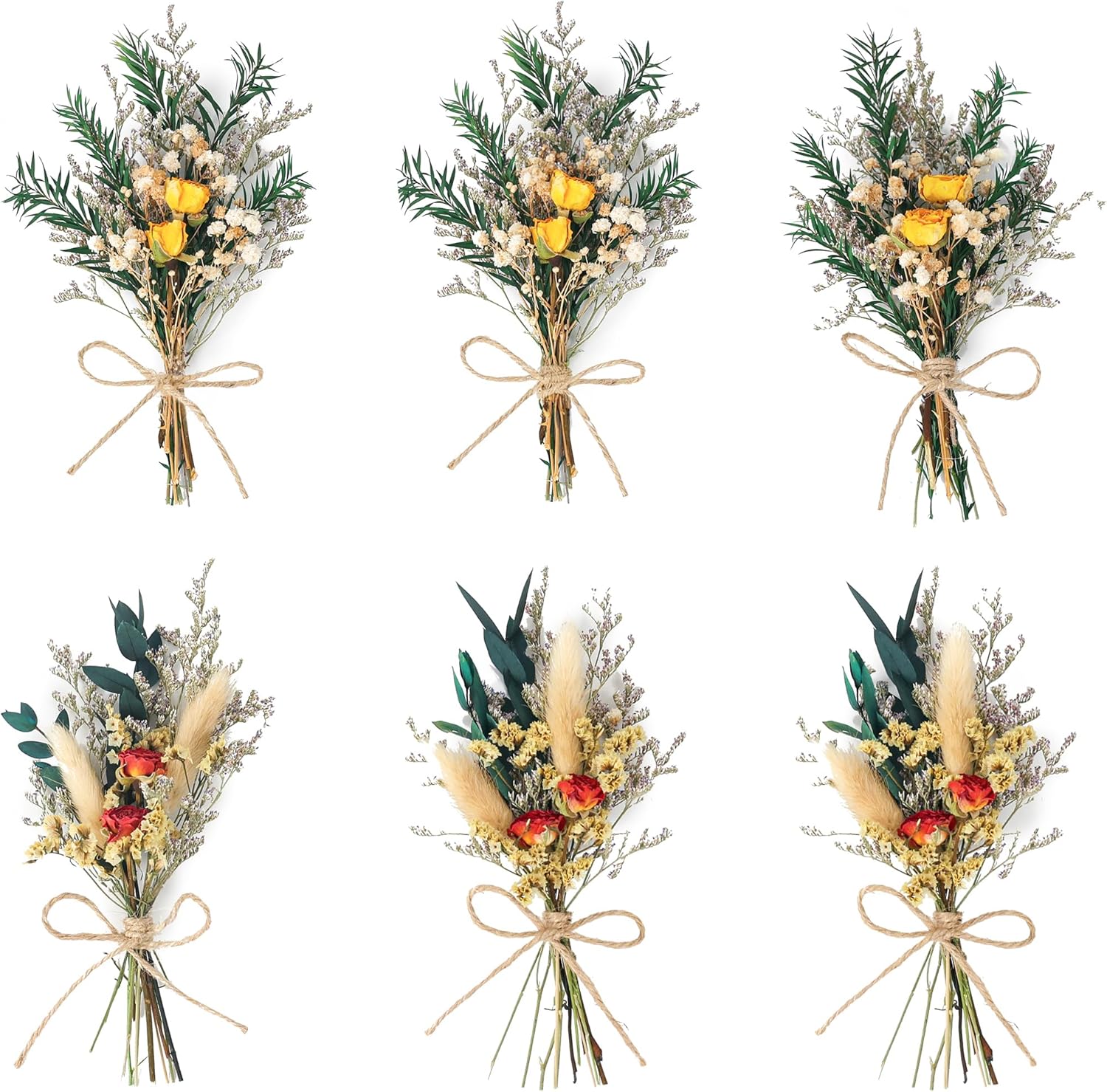 - ❤Exquisite bouquet with a variety of combinations:6 Pieces Mini Dried Flower Bouquet It is a combination of a variety of natural dried flowers, including yellow box red multi-head roses, bunny tails, sea lavender, green pine boughs and preserved fine-leafed eucalyptus leaves, and other rustic, rustic elements, which you can mix and match to meet a variety of decorative preferences.