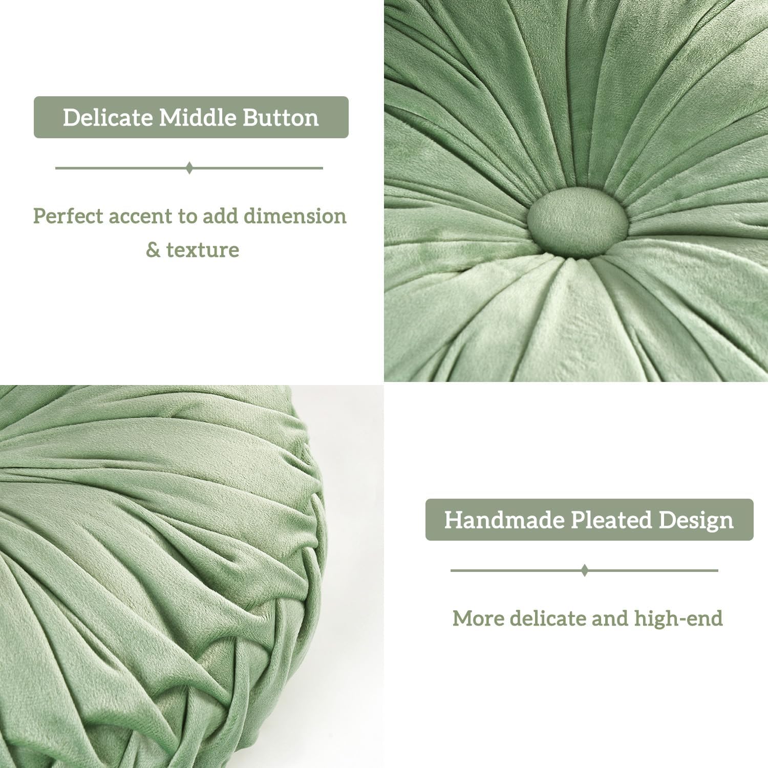 HIG Set of 2 Decorative Round Pleated Throw Pillows, Classy Accent Pumpkin Throw Pillows with Center Button, Vintage Velvet Floor Pillows for Sofa Vanity Chair Bed, Sage, 14.5" Diameter(Ripple)