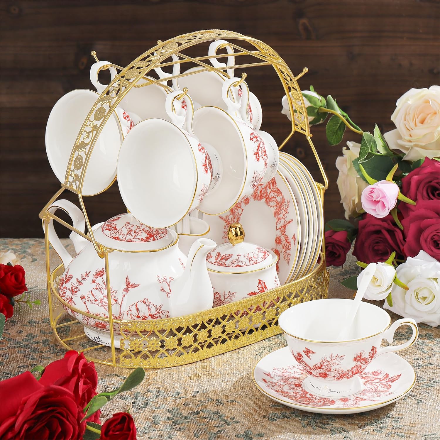 fanquare Vintage Porcelain Tea Set with Holder, 22 Piece Red Floral New Bone China Tea Coffee Gift Sets for Wedding Birthday, 6 Tea Cup and Saucers for Women Tea Party