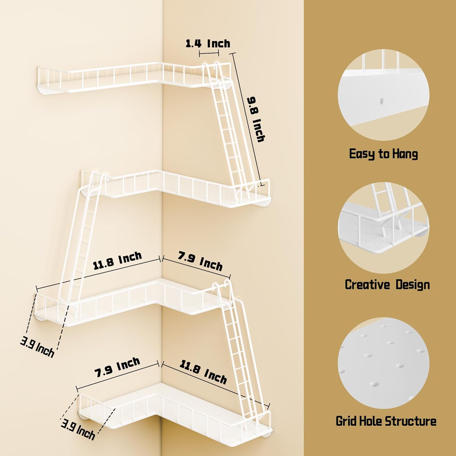 - ăSPACE SAVING CORNER SHELFăDesigned for tight spaces, this corner wall shelf effectively utilizes the corner area of the room, not only saving space but also adding an element of interest to any room. The tiered shelves can hold a variety of items such as figurines, decorative objects, knick-knacks, plants, small books or other items.